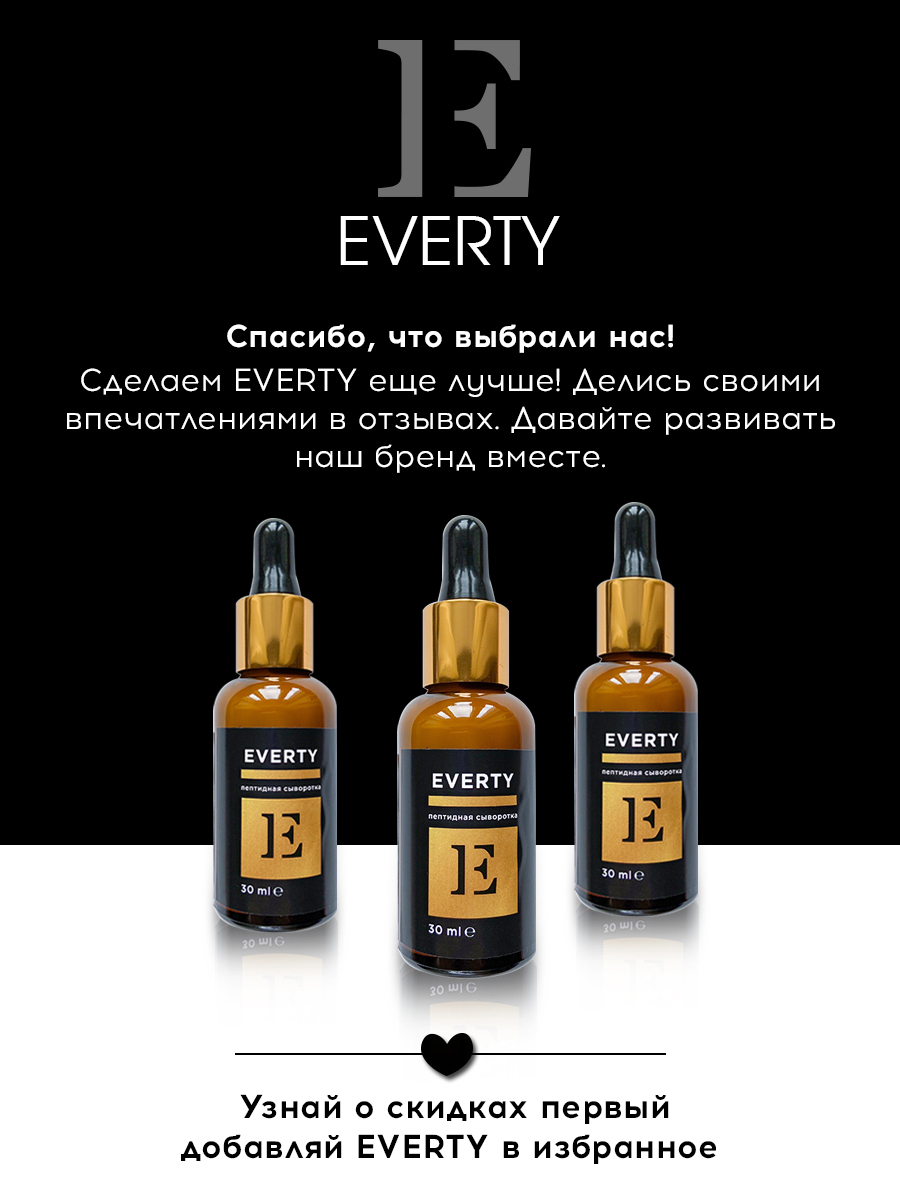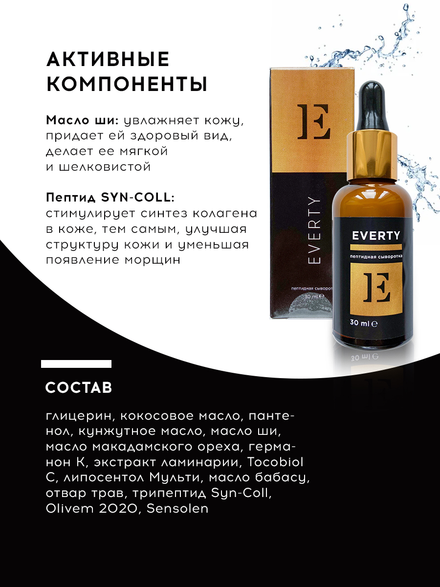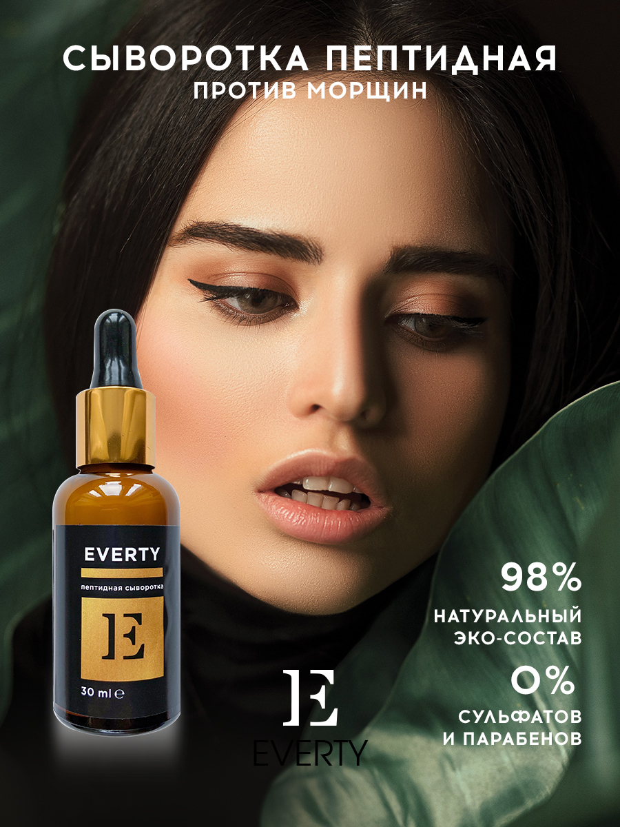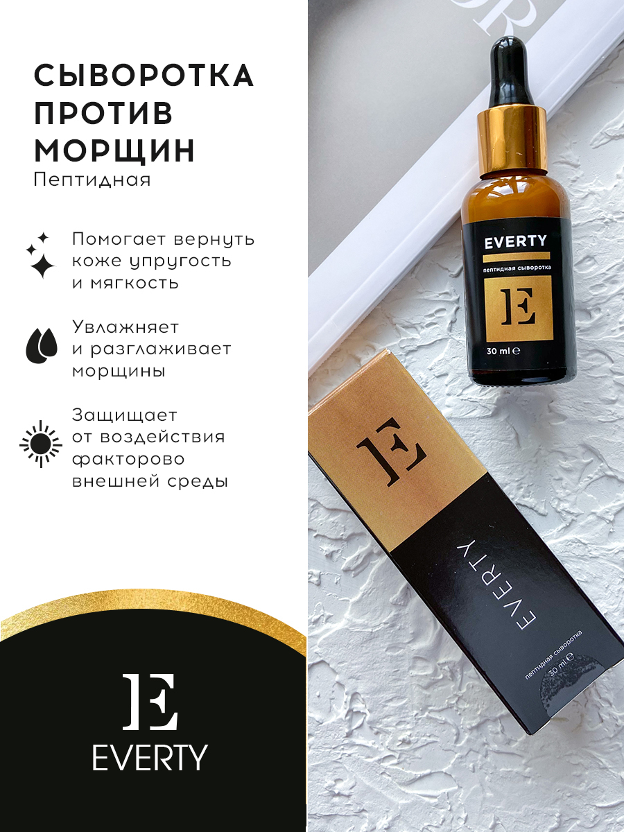 Мульти активная пептидная сыворотка для ухода за лицом EVERTY Уменьшает и разглаживает мелкие морщинки, улучшается рельеф и цвет кожи. Обеспечивает увлажнение и восстановление при регулярном использовании. Идеально сочетается с другими средствами для ежед