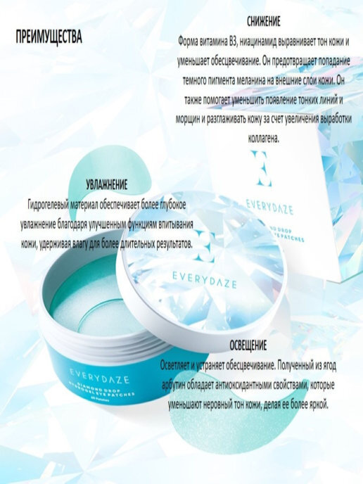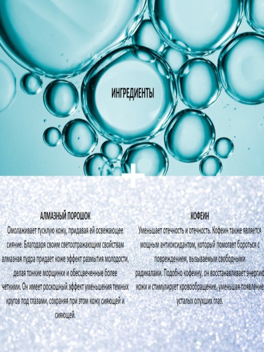 Состав:Вода, глицерин, порошок Chondrus Crispus, дипропиленгликоль, бензилгликоль, алмазный порошок, фильтрат фермента Galactomyces, ниацинамид, арбутин, гиалуронат натрия, аденозин, кофеин, гидролизованный экстракт Acacia Macrostachya Seedme, экстракт се