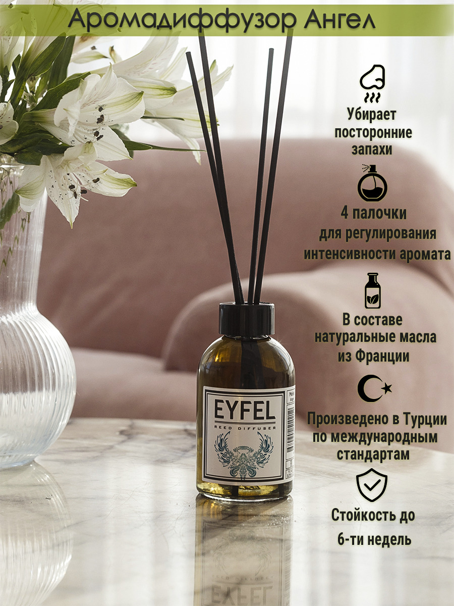 Аромадиффузор Ангел от бренда EYFEL уже стал легендарным благодаря своему эксклюзивному аромату, он продолжит распылять спокойствие в ваших комнатах благодаря обновленной увлекательной формуле и дизайну флакона.Этот богатый аромат представлен сладким древ