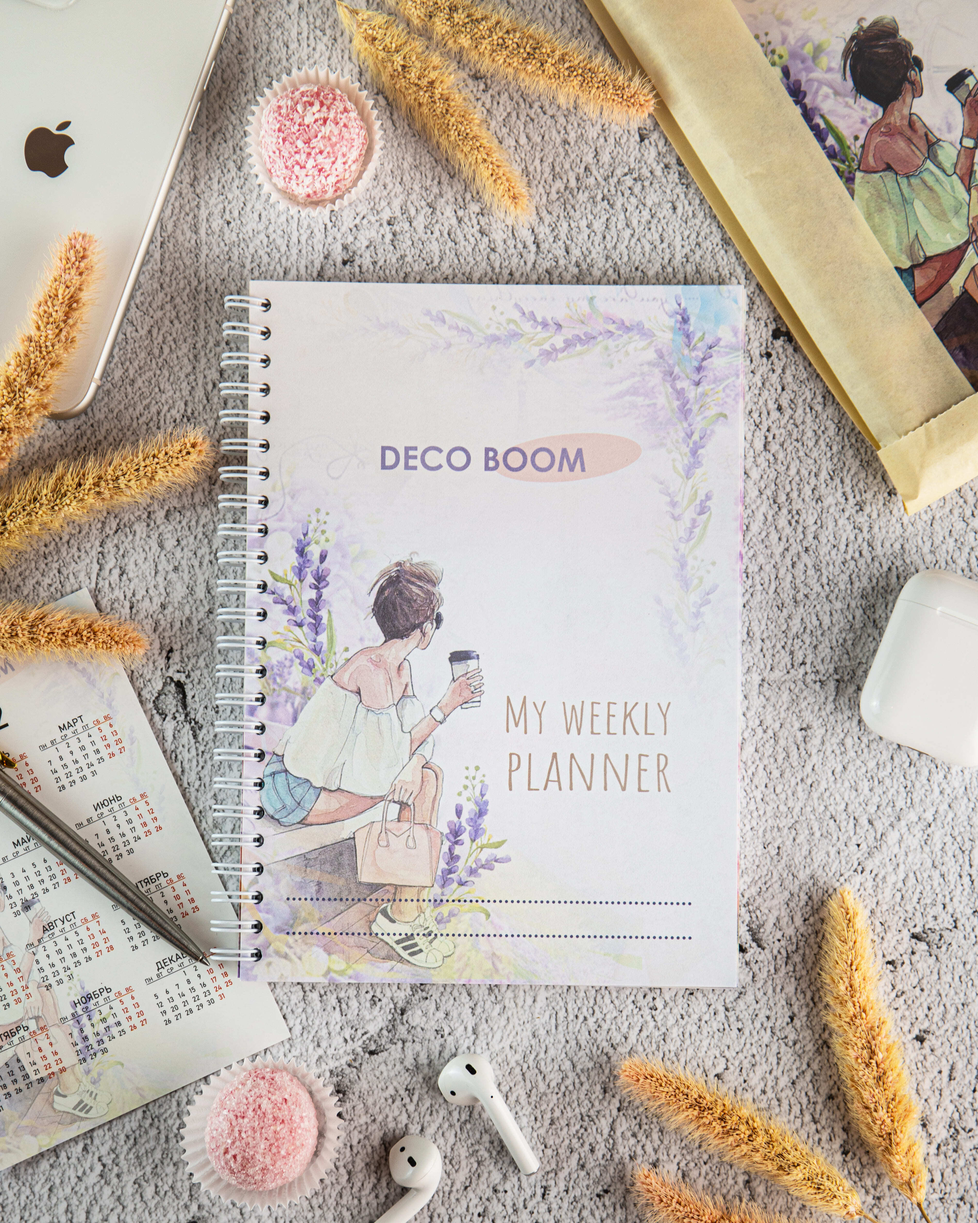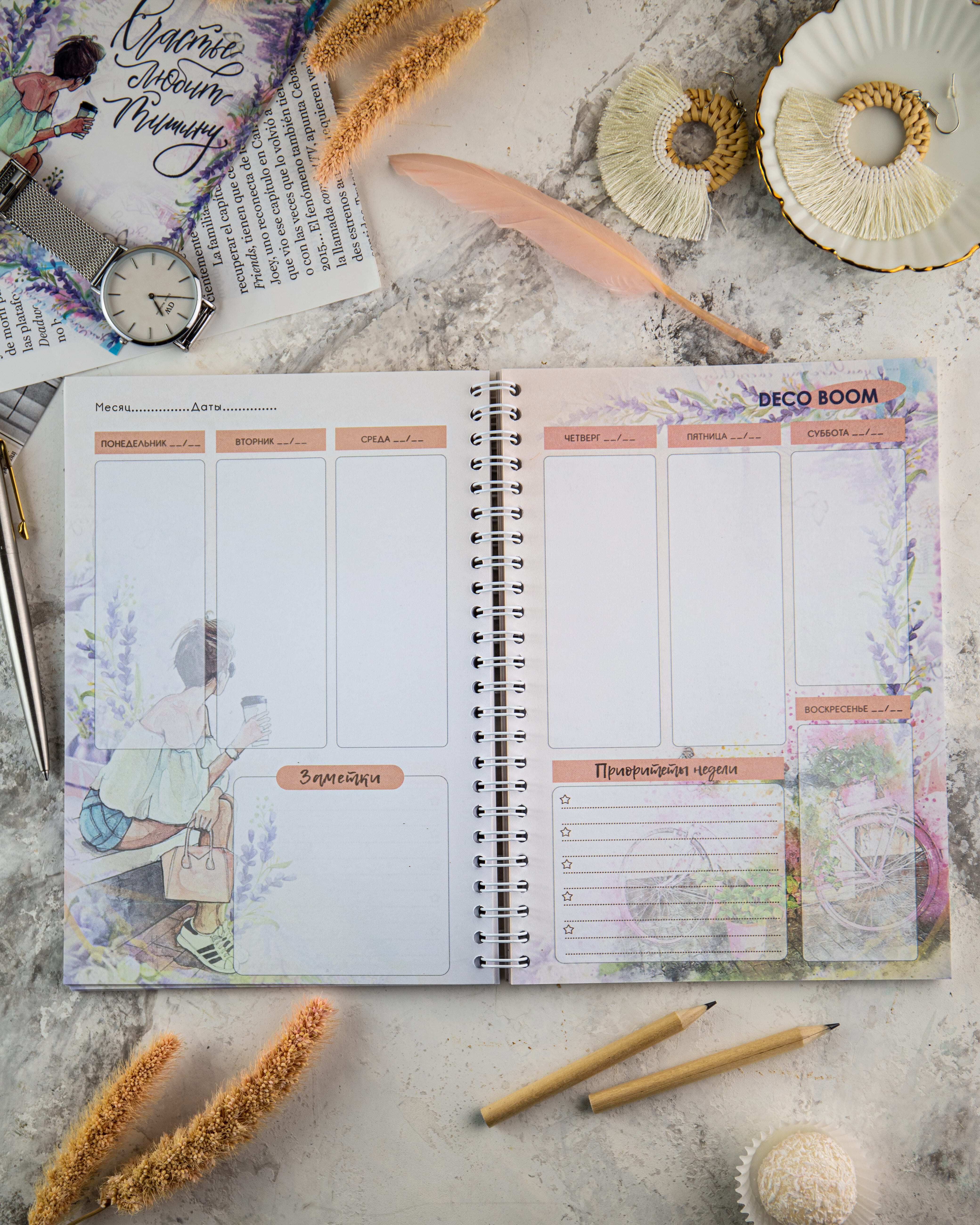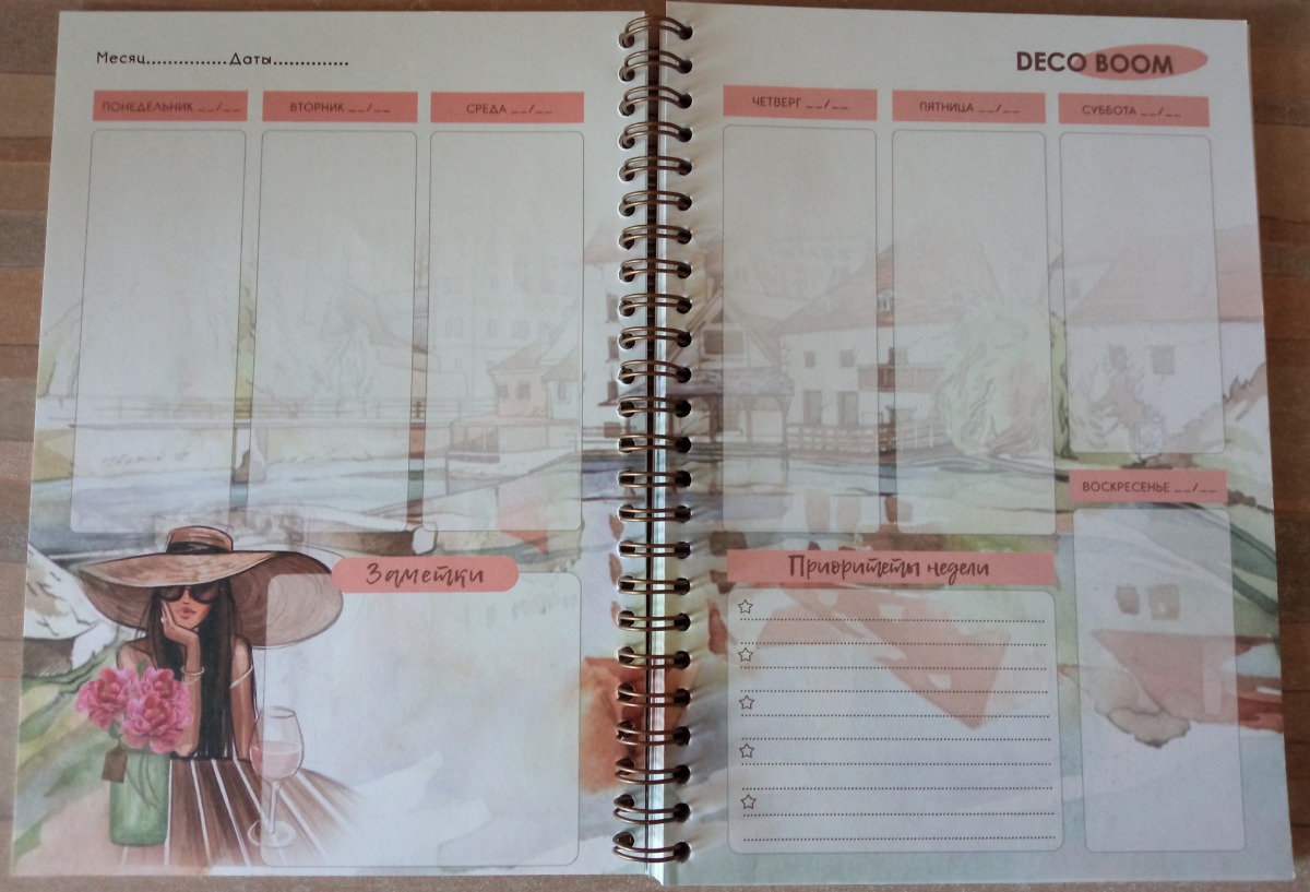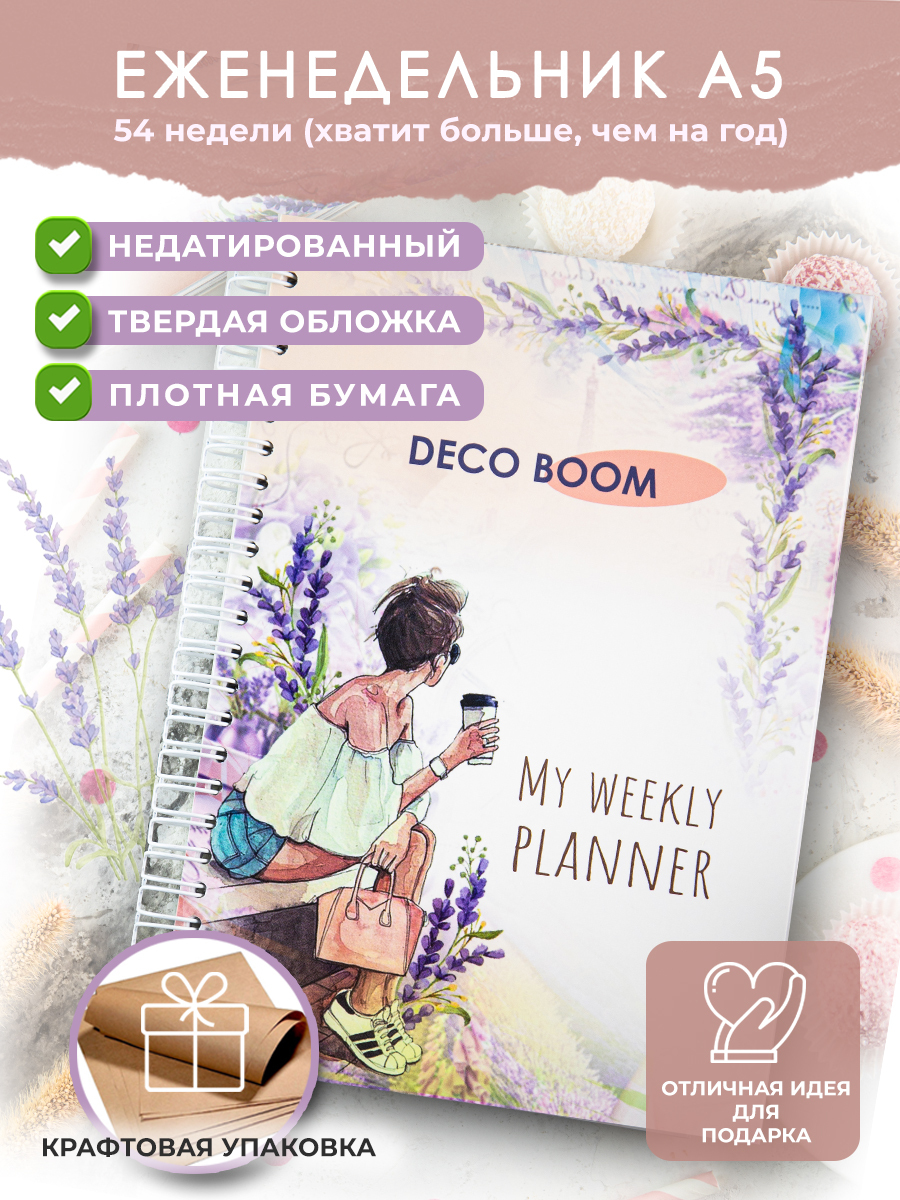 Комплектация:Планер А5; открытка-закладка; крафтовый пакетОписание:Стильный и универсальный блокнот-планер на пружине станет Вашим незаменимым помощником в планировании своей недели. Вся площадь поделена на функциональные зоны. Планер удобно хранить как н