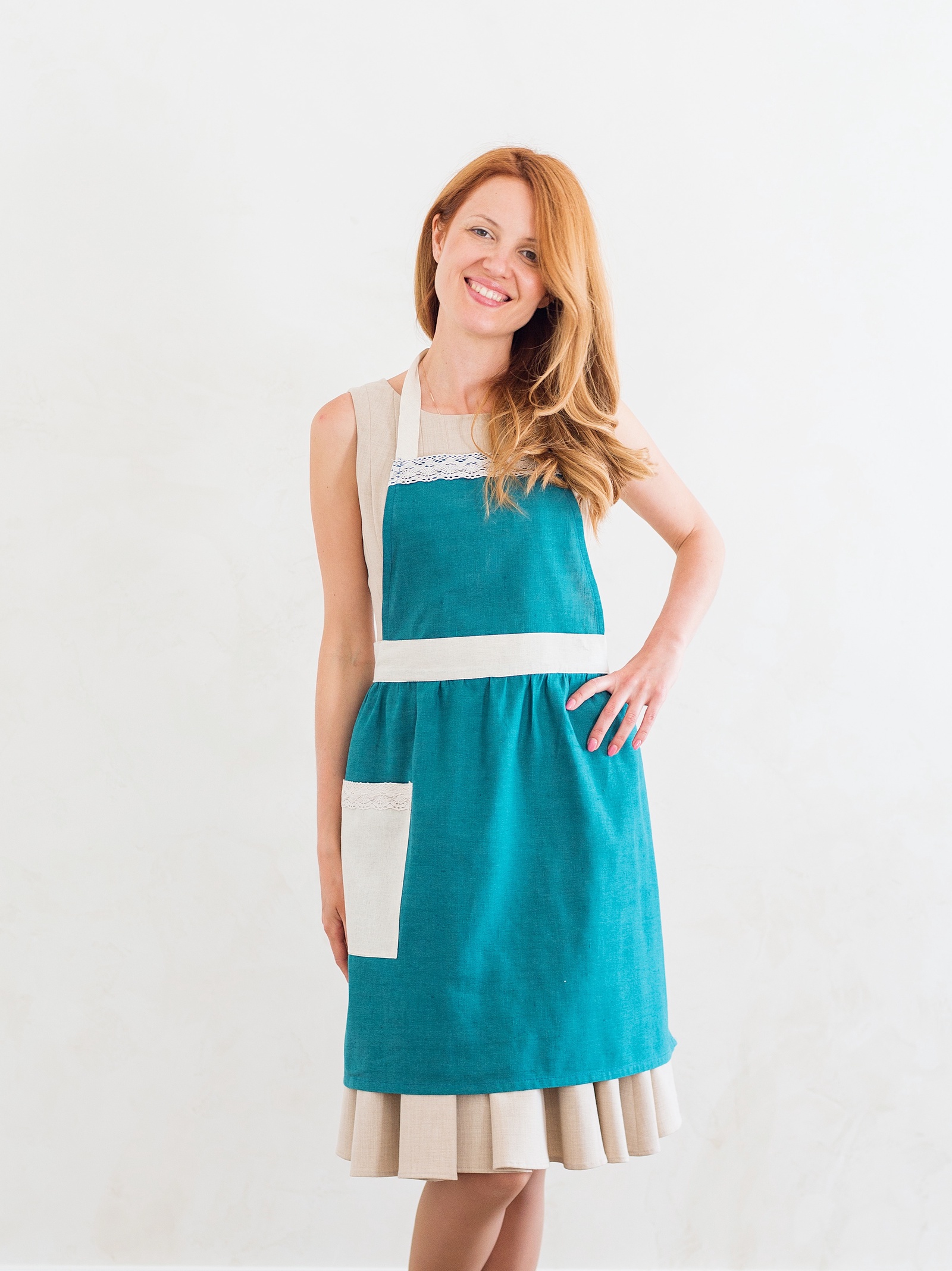 Комплектация:ФартукОписание:Кухонный фартук из коллекции "Лен Меренга" - очень яркий, красивый и женственный аксессуар для кухни. Цвет - насыщенный тёмно-бирюзовый, цвет морской волны со светло-бежевыми лямками, поясом, завязками и карманом. Этот фартук о