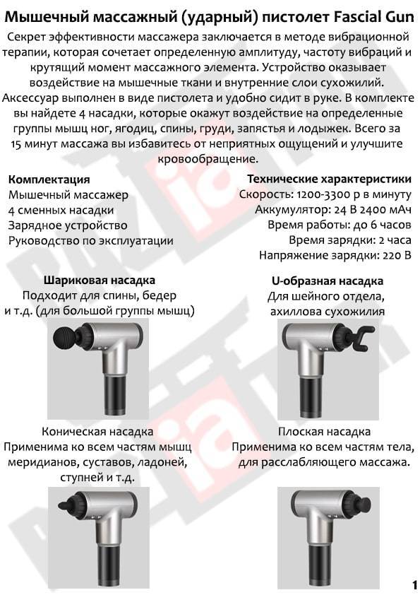 Комплектация:4 сменных насадки для массажного пистолета: насадка для суставов для больших групп мышц; насадка для шейных позвонков в форме буквы U; насадка для маленьких круглых суставов для суставов; насадка для плоских суставов для всего телаОписание:Ма