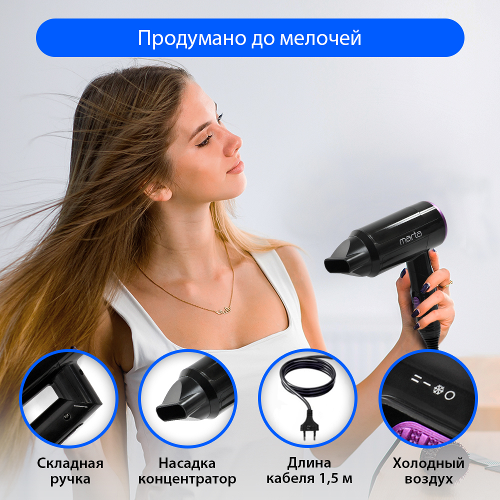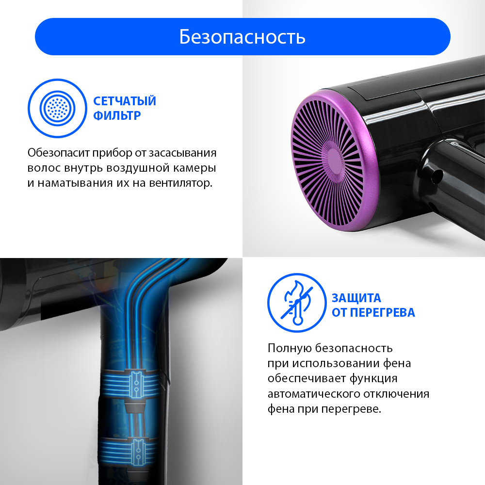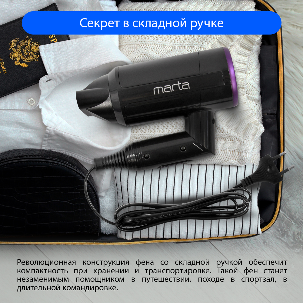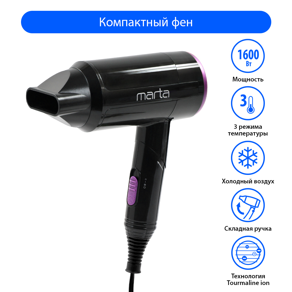 Особенности конструкции фена, выпрямителя волосКомпактный размер, Складная ручка, Защита от перегрева