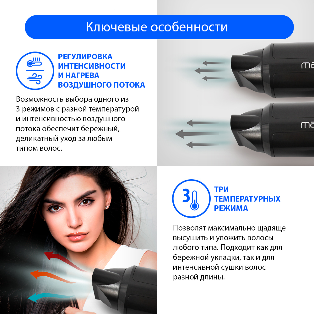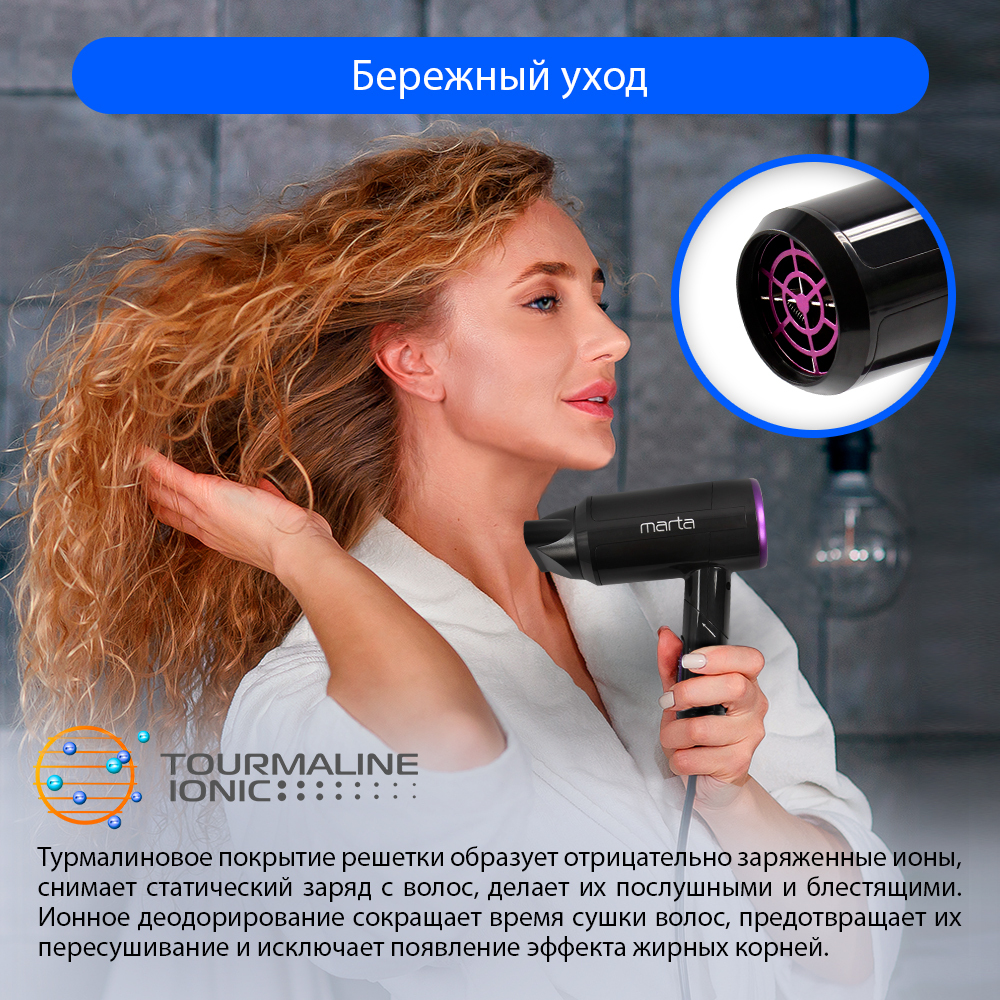 Компактный фен из высококачественного термостойкого пластика с тремя режимами для выбора оптимальной температуры воздушного потока и технологией tourmaline ion, которая образует отрицательно заряженные ионы, снимает статический заряд с волос, делает их п