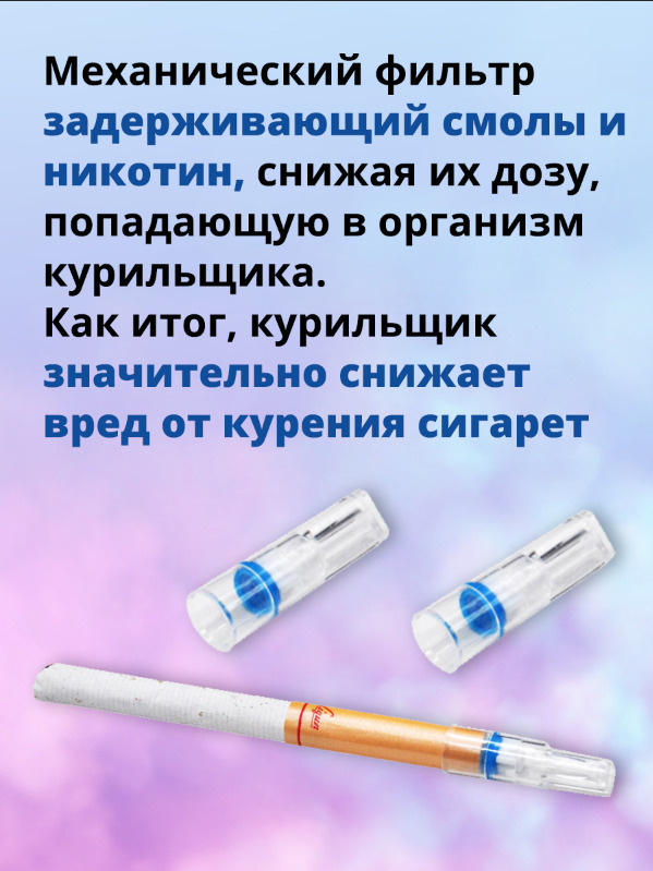 Комплектация:В упаковке 10 фильтровОписание:Уникальная фильтрующая технология!Мундштук фильтр подходят для любых сигарет стандартного размераПроцесс курения становится существенно менее вредным, а никотиновая зависимость уменьшается.Снижается риск онколог