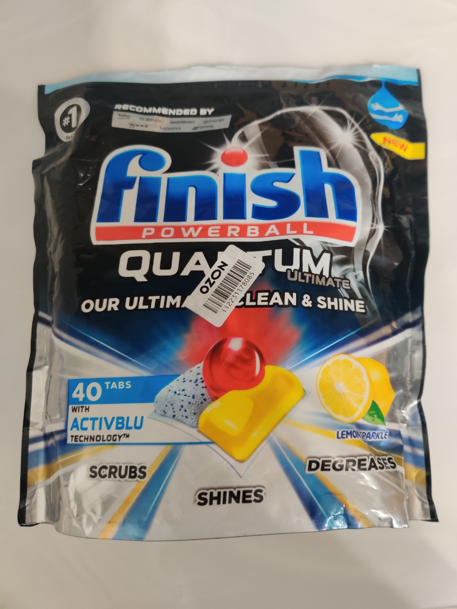 Состав:15% или более, но менее 30%: неионогенные ПАВ; 5% или более, но менее 15%: отбеливающие вещества на основе кислорода, поликарбоксилаты, фосфонаты; энзимы; ароматизирующие добавки, в т.ч. бензилбензоат, гераниолОписание:Finish Quantum Ultimate – это