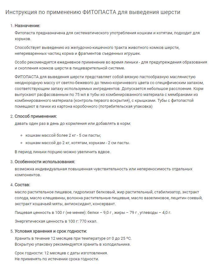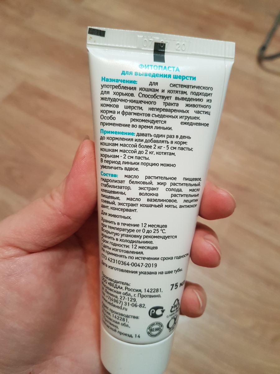 Комплектация:Паста для вывода шерсти 1 штОписание:ПАСТА для выведения шерсти,75мл.Способствует выведению из желудочно-кишечного тракта кошек (котят) комков шерсти, непереваренных частиц корма и фрагментов съеденных игрушек.Ежедневное применение пасты во в