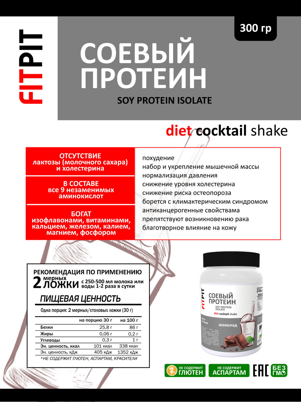 Не содержитГМО, Глютен, Искусственные красители, Аспартам