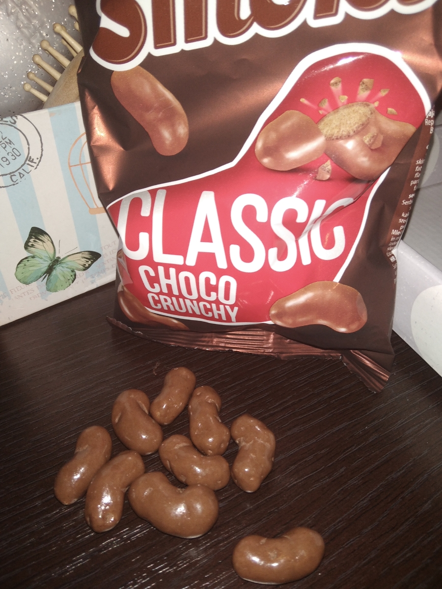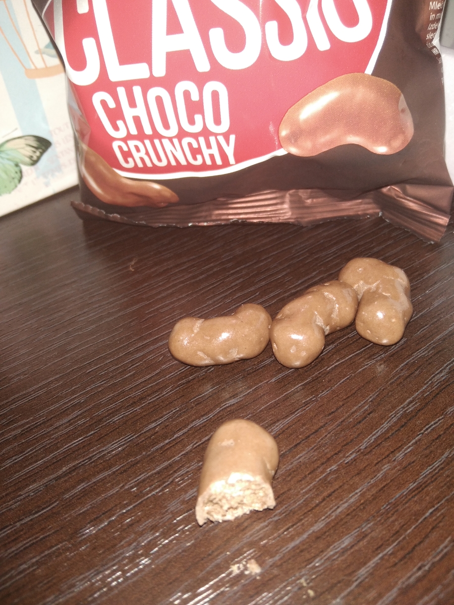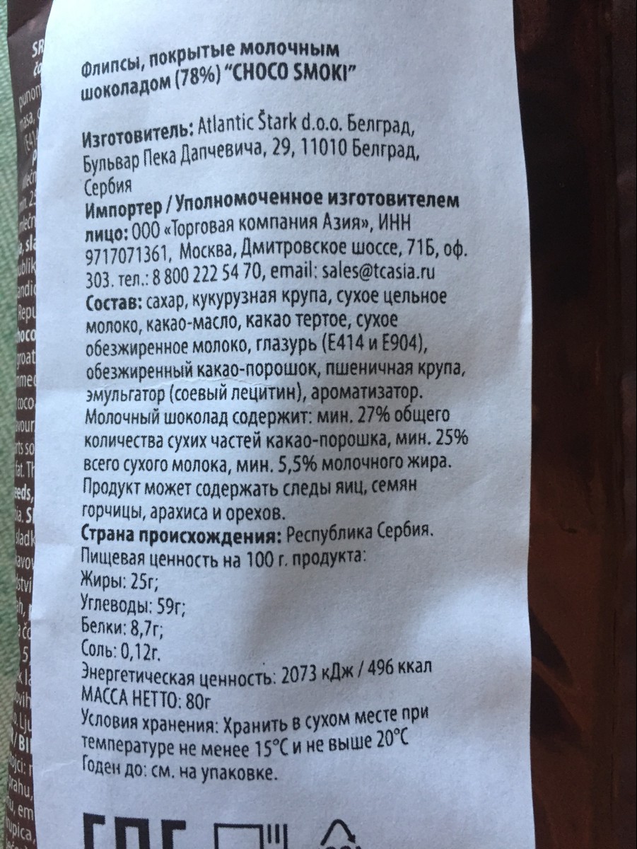 Состав:сахар, кукурузная крупа, сухое цельное молоко,какао-масло, какао тертое, сухое обезжиренное молоко,глазурь (Е414 и Е904), обезжиренный какао-порошок,пшеничная крупа, эмульгатор (соевый лецитин),ароматизатор. Молочный шоколад содержит: мин. 27%общег