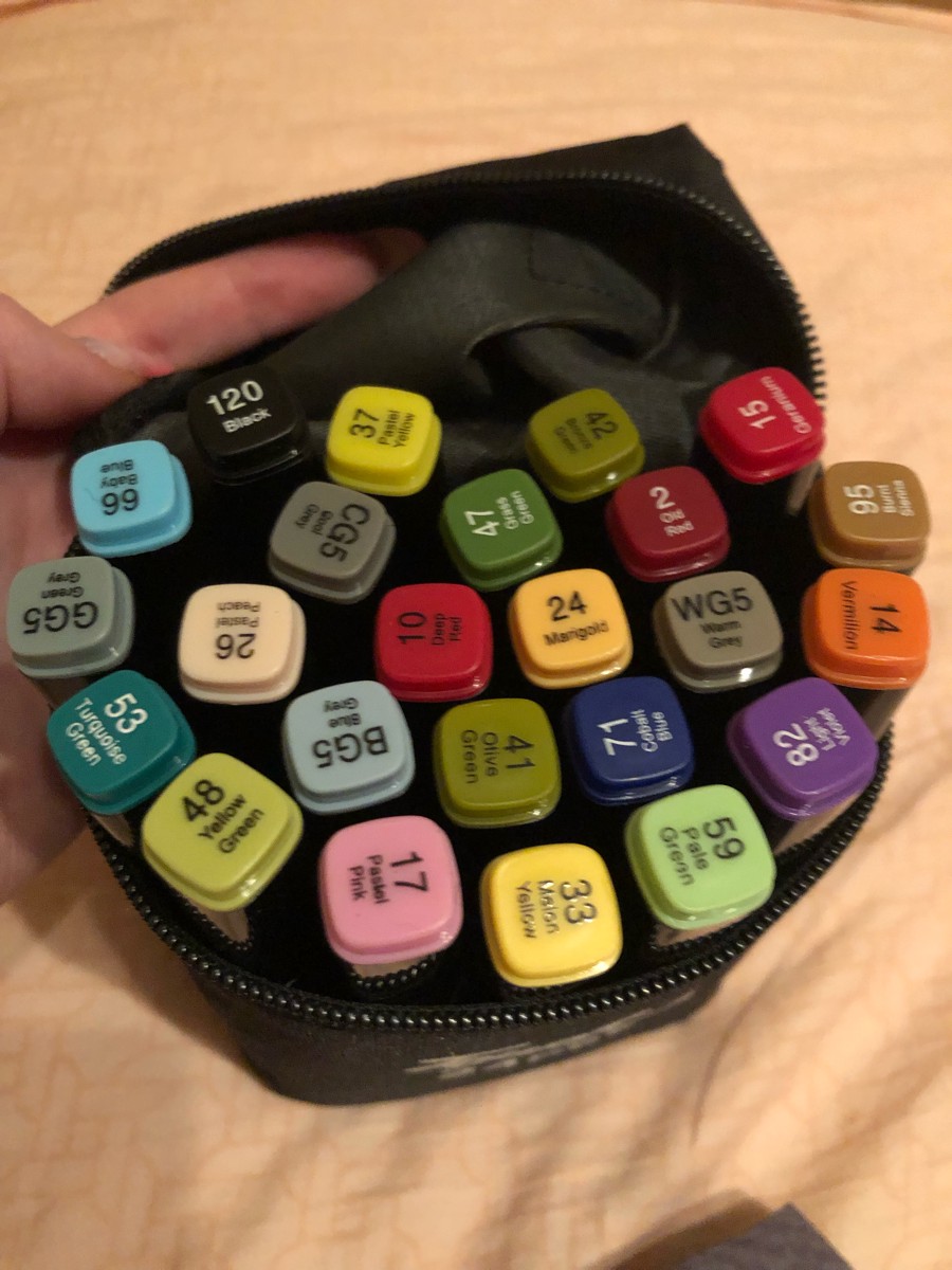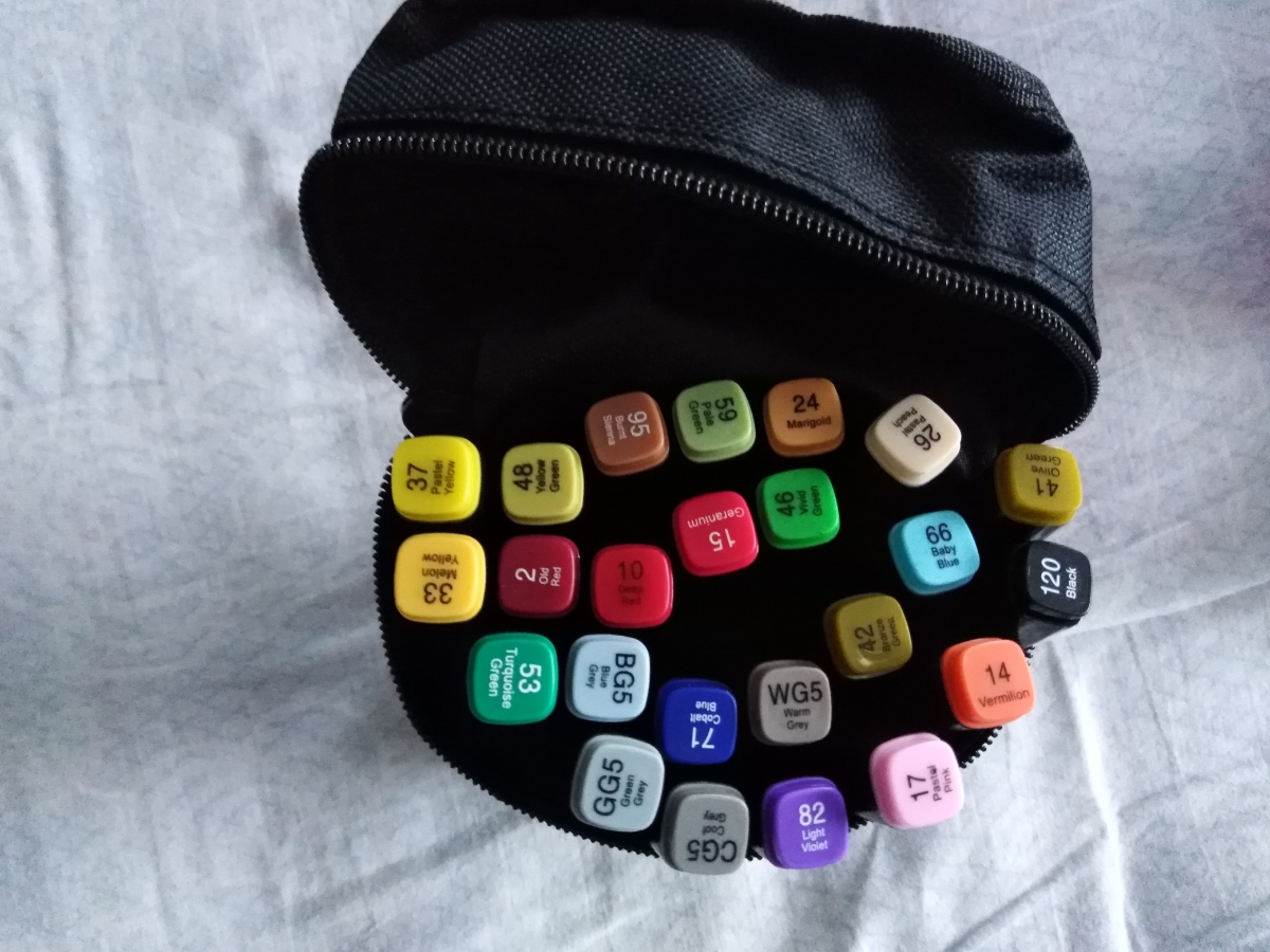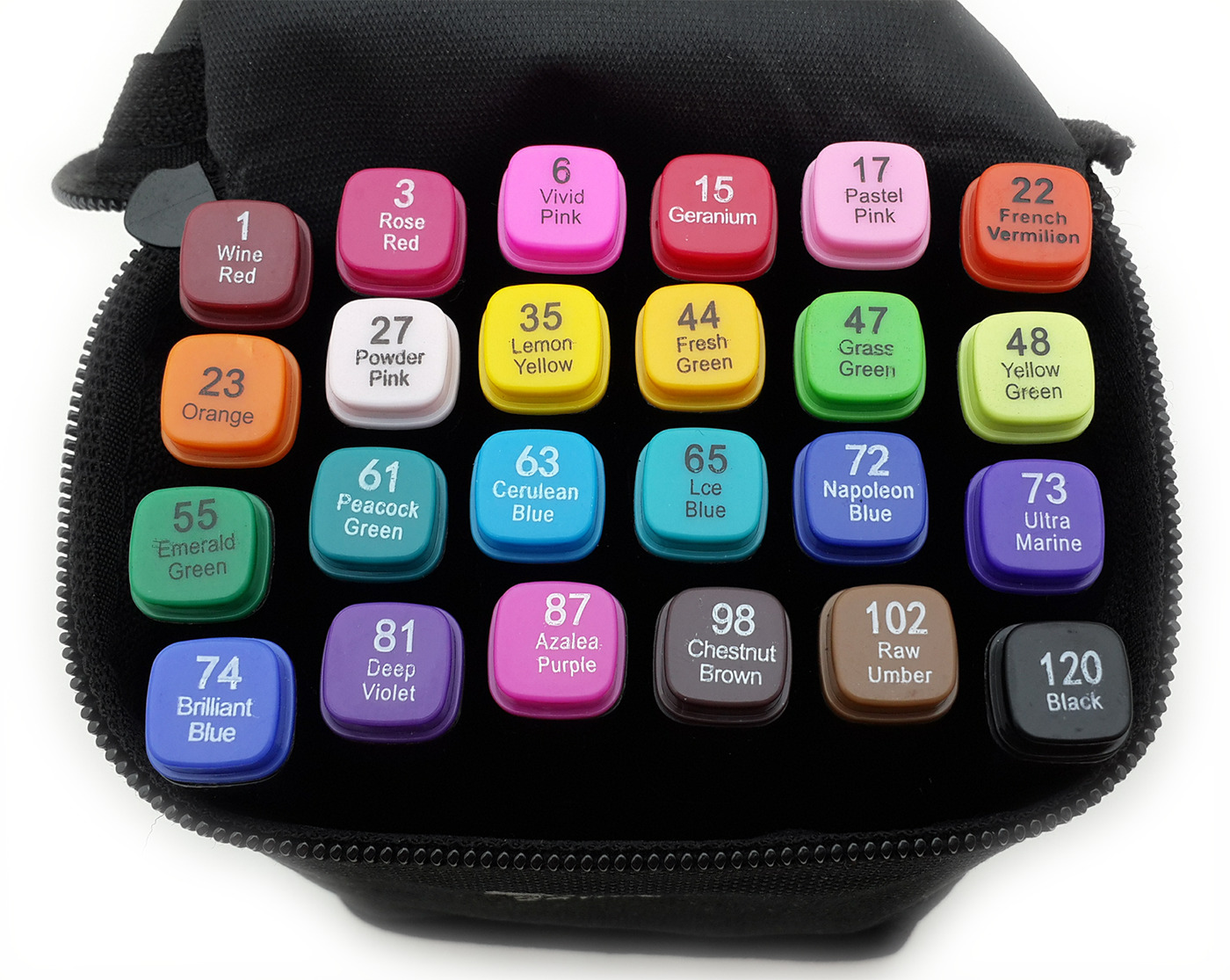 Комплектация:Футляр из плотной ткани на молнии, с ручкой - 1 шт.Фломастеры двусторонние - 24 шт.Описание:Набор из 24-х спиртовых двусторонних маркеров в футляре из плотного материала на молнии с ручкой.Основная сторона - классическая перьевая (толщина лин