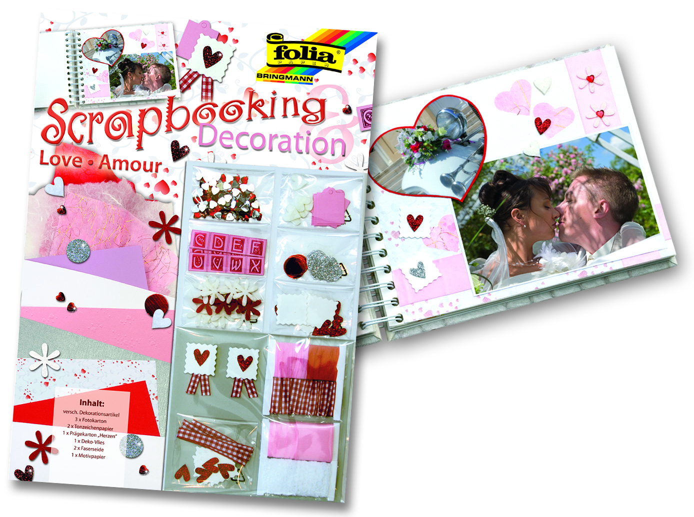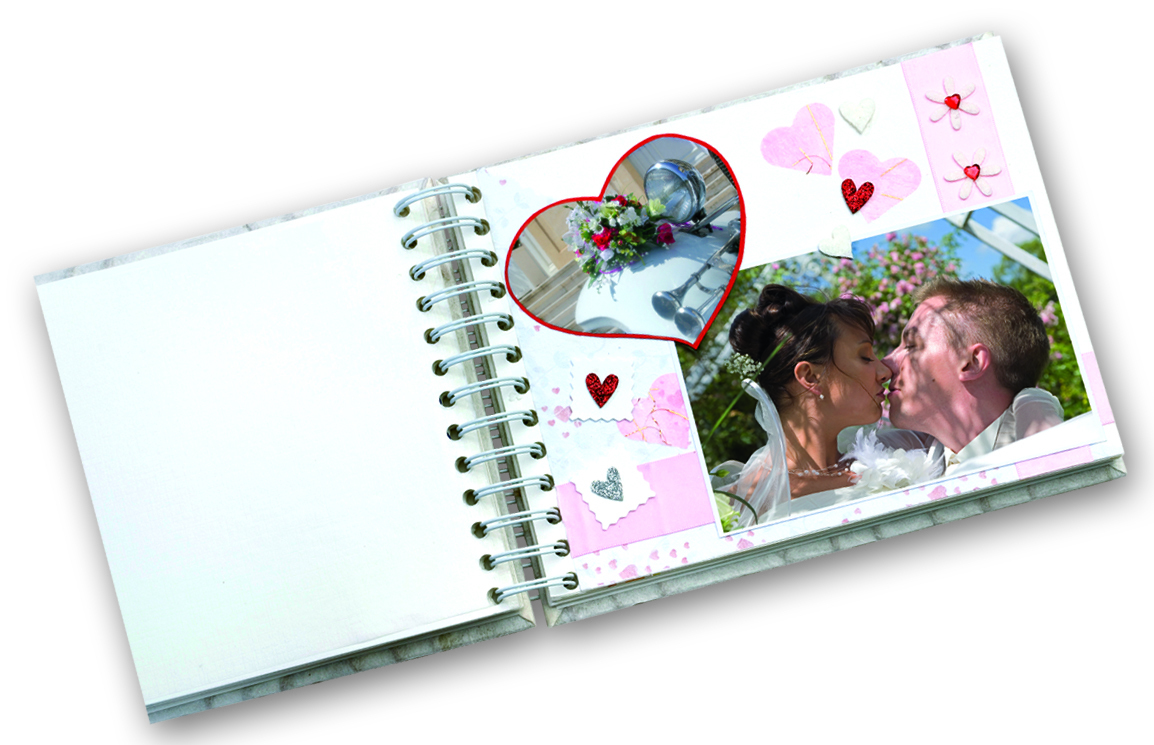 В набор входит различная бумага и элементы декора: 3 двусторонние картонные основы для крепления фотографии: белая, красная, серебряная, 2 листа двусторонней плотной бумаги: белая и фиолетовая, 1 лист розового цвета с тиснением сердце, 1 лист фотобумаги с
