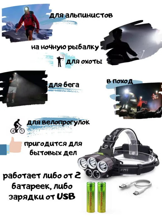 Комплектация:Налобный фонарь с налобным креплением и аварийным маячком с тыльной стороны;Кабель питания USB;2 (два) съемных аккумулятора элемента AA на 8800mAh, 18650.Описание:Налобный фонарь Headlamp K85 T6 обладает многими возможностями. Это практичный