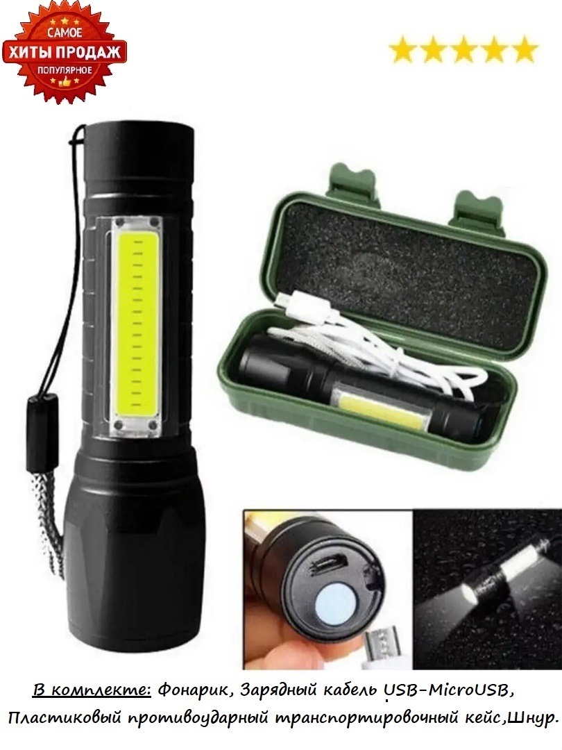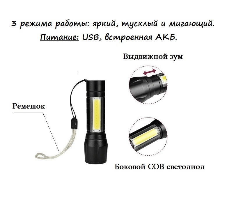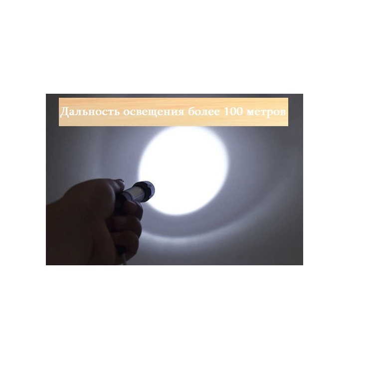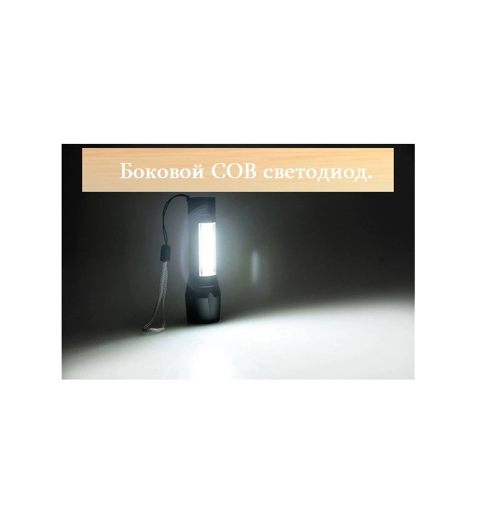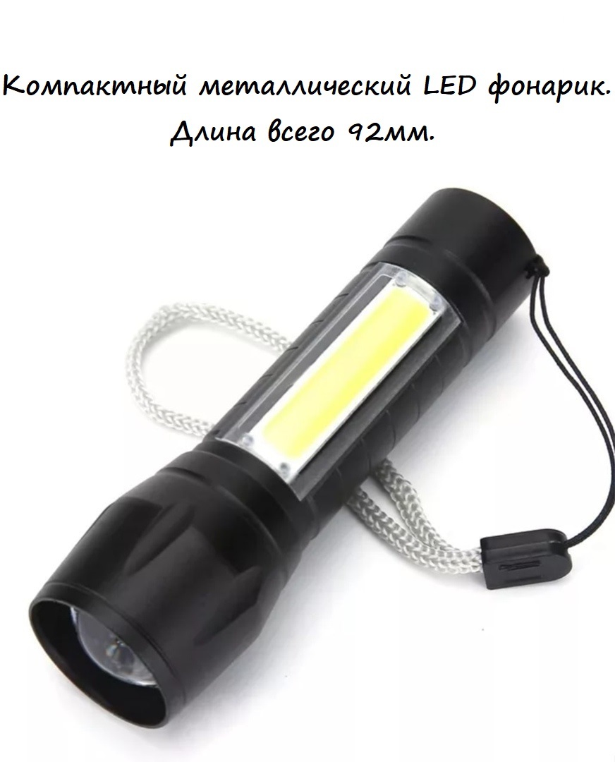 Компактный металлический LED фонарик с одним основным мощным светодиодом и одним боковым COB светодиодом. Размеры фонарика - длина: 92 мм (100 мм выдвижной zoom), благодаря этому он легко поместится в ваш карман и будет всегда под рукой.Дальность освещени