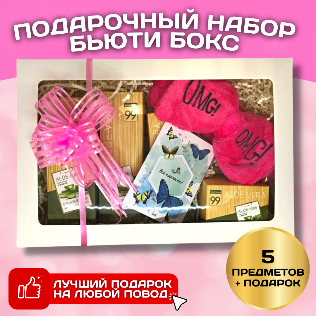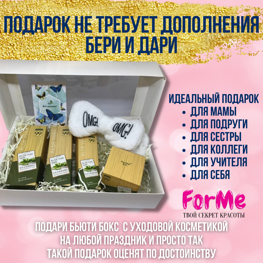 Бьюти бокс из 4 полноразмерных увлажняющих средств с Алоэ Вера по уходу за кожей лица с повязкой для волос и открыткой станет отличным подарком на 14 февраля, 8 марта, день рождения, любой праздник и просто так.В наборе есть всё необходимое для того, чтоб