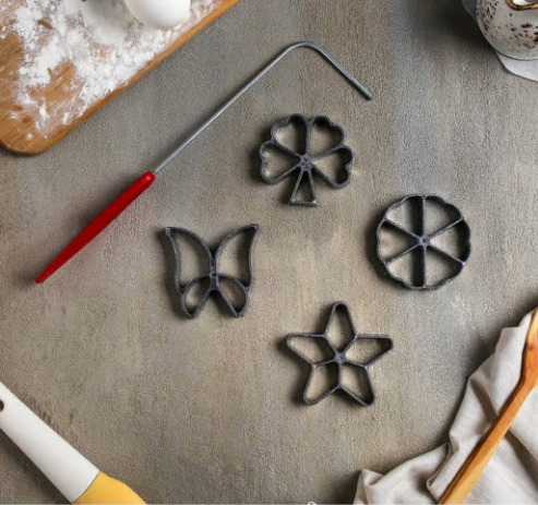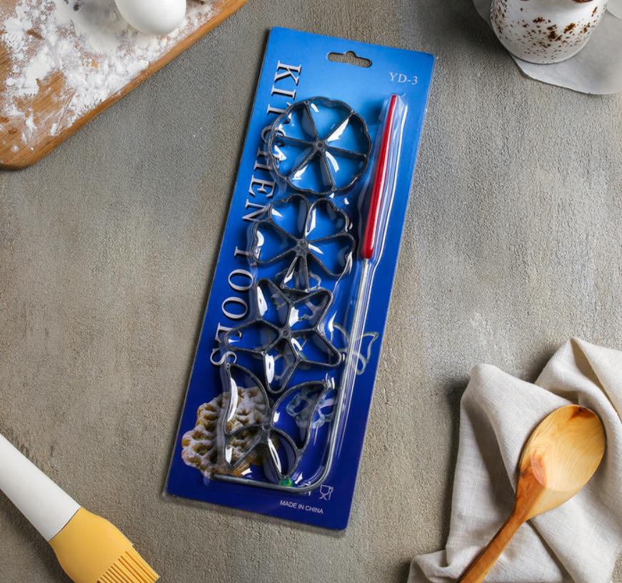 Формочки кулинарные предназначены для приготовления хвороста из жидкого теста. В набор входят 4 фигурных насадки из алюминия и металлический держатель с пластиковой ручкой. Диаметр форм кондитерских для хвороста - 7 см, высота - 1 см. Длина держателя - 30
