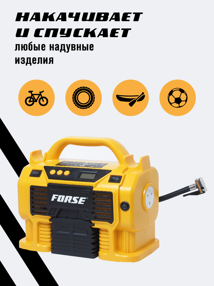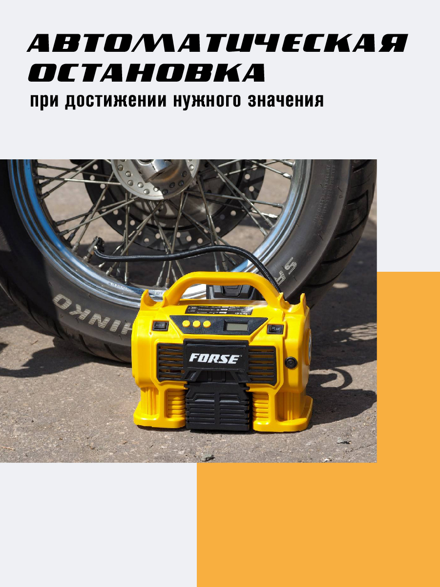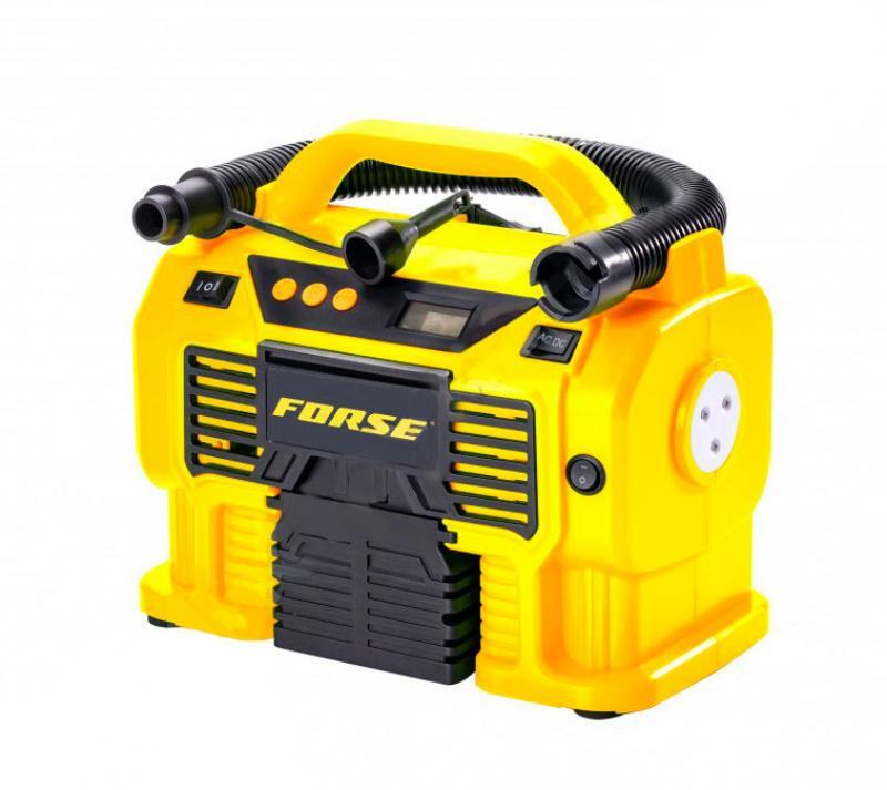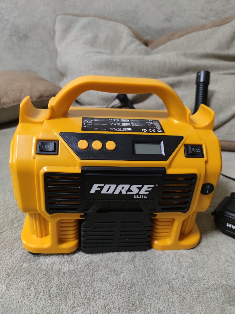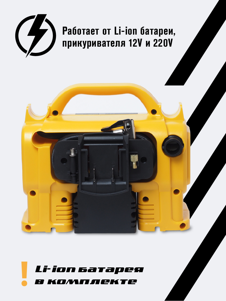 Комплектация:1) Компрессор2) Шланг высокого давления3) Шланг воздушный с конической насадкой4) Встроенный фонарь6) Li-ion батарея7) Зарядное устройство8) Переходные штуцеры - 3шт (для накачки колёс, мячей, надувных изделий)9) Инструкция по эксплуатации10)