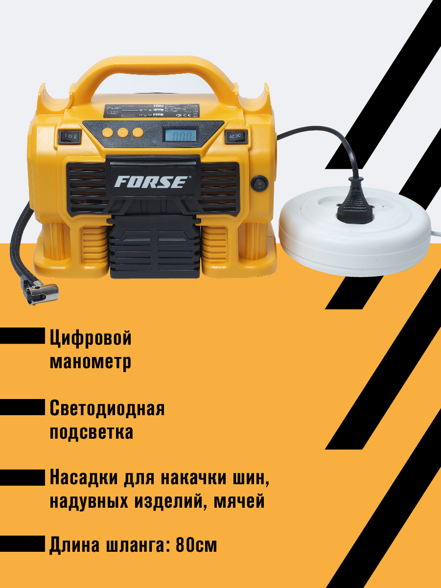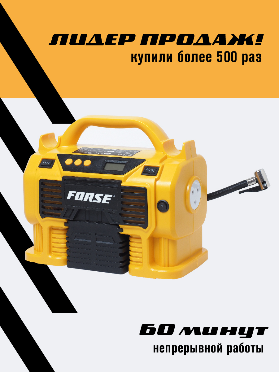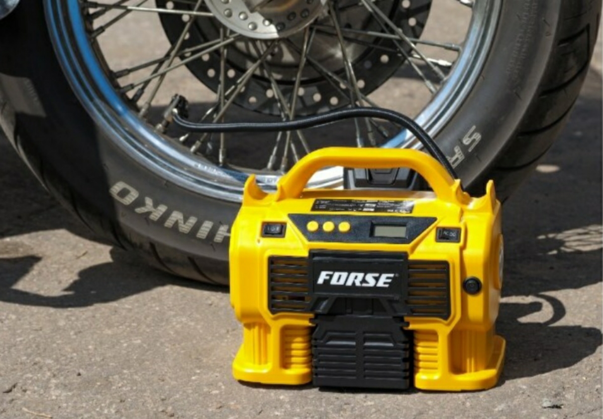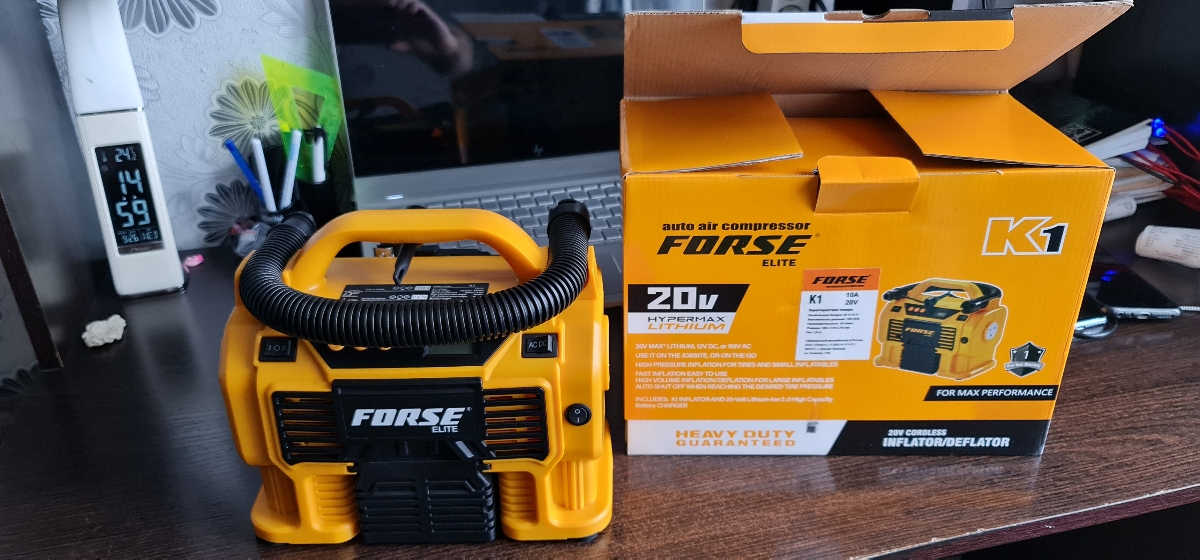 Комплектация:1) Компрессор2) Шланг высокого давления3) Шланг воздушный с конической насадкой4) Встроенный фонарь6) Li-ion батарея7) Зарядное устройство8) Переходные штуцеры - 3шт (для накачки колёс, мячей, надувных изделий)9) Инструкция по эксплуатации10)