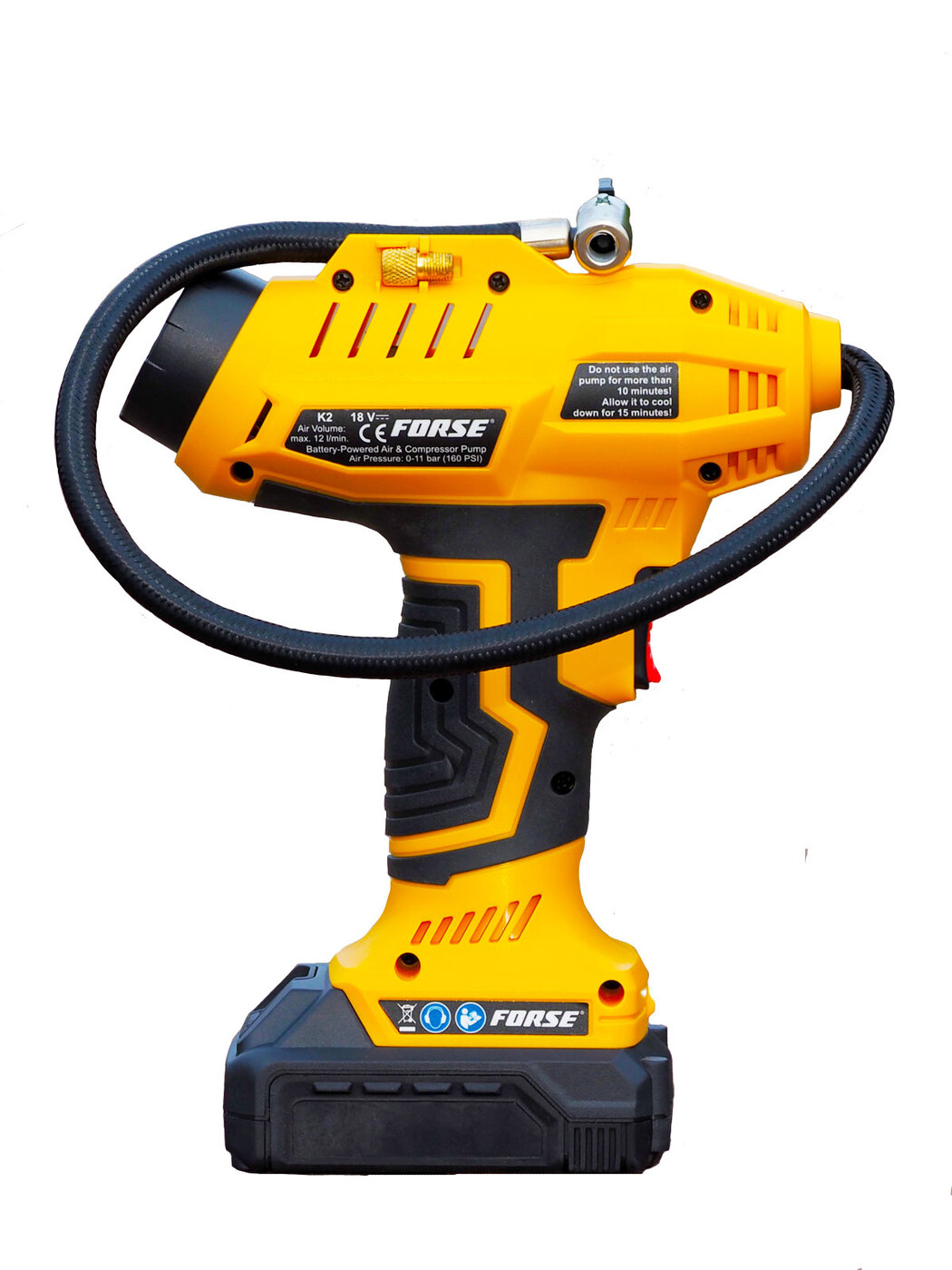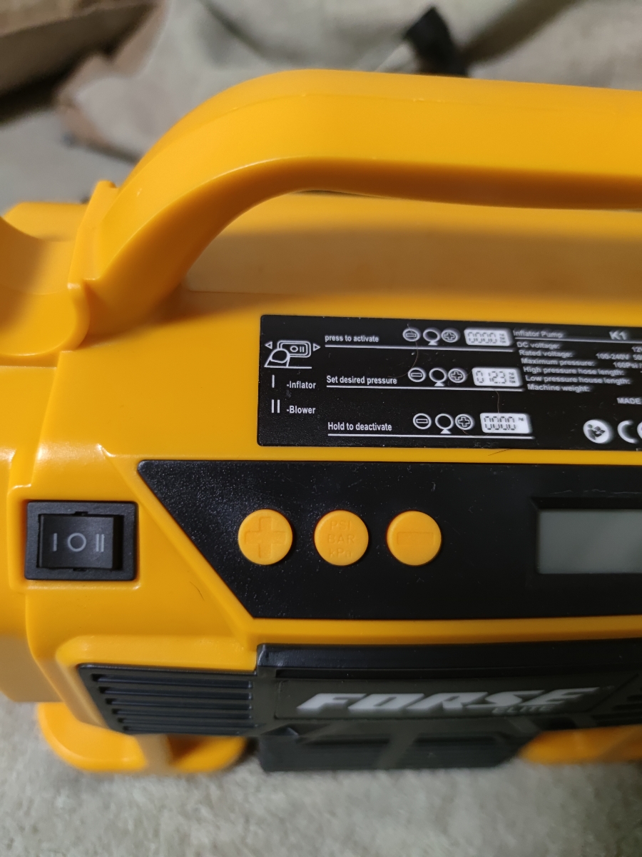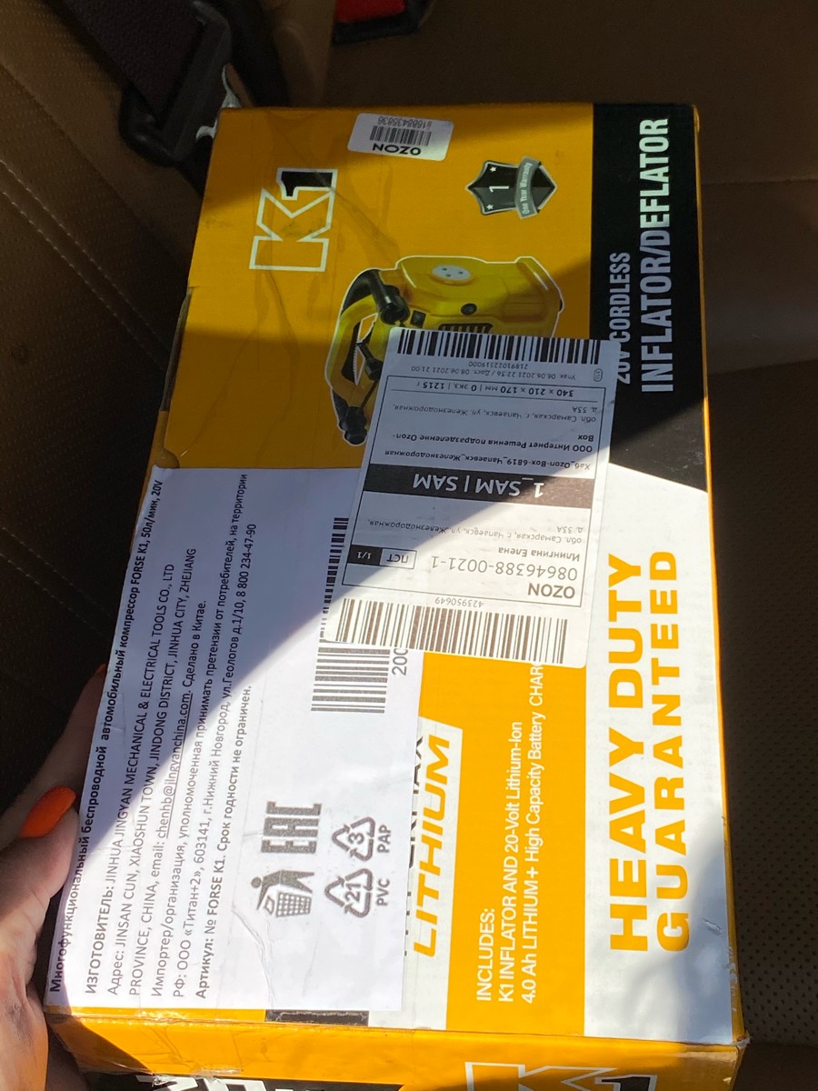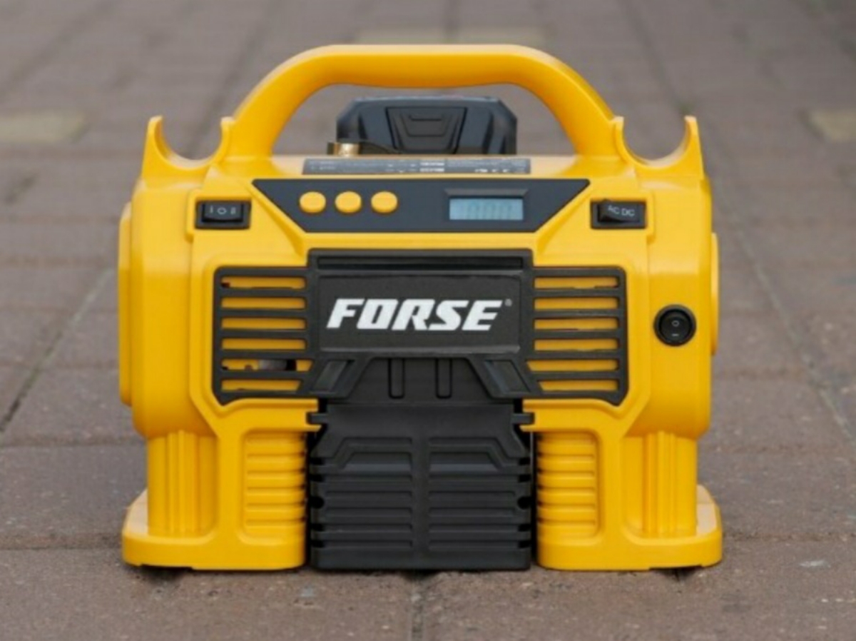 Комплектация:1) Компрессор2) Шланг высокого давления3) Шланг воздушный с конической насадкой4) Встроенный фонарь6) Li-ion батарея7) Зарядное устройство8) Переходные штуцеры - 3шт (для накачки колёс, мячей, надувных изделий)9) Инструкция по эксплуатации10)