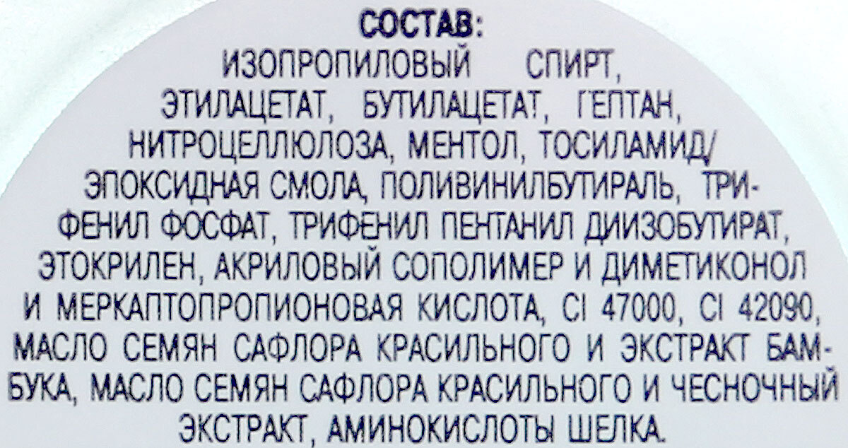 Состав:ЭТИЛАЦЕТАТ, БУТИЛ АЦЕТАТ, НИТРОЦЕЛЛЮЛОЗА, АДИПИНОВАЯ КИСЛОТА/НЕОПЕНТИЛ ГЛИКОЛЬ/ ТРИМЕЛЛИТОВЫЙ АНГИДРИД СОПОЛИМЕР, АЦЕТИЛ ТРИБУТИЛ ЦИТРАТ, ИЗОПРОПИЛОВЫЙ СПИРТ, БЕНЗОФЕНОН – 3, ТРИМЕТИЛПЕНТАНЕДИИЛ ДИБЕНЗОАТ, ПОЛИВИНИЛБУТИРАЛЬ, АЛОЭ ВЕРА, ВИТАМИН В, В
