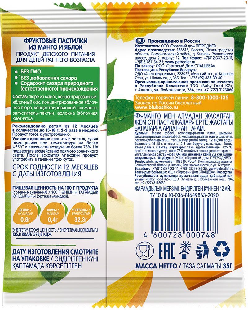 Состав средства:Пюре из манго, концентрированный яблочный сок, концентрированное яблочное пюре, концентрированный сок манго, загуститель-пектин, волокна (яблочная клетчатка). Без ГМО. Без добавления сахара.Условия хранения:Хранить в чистых, сухих помещени