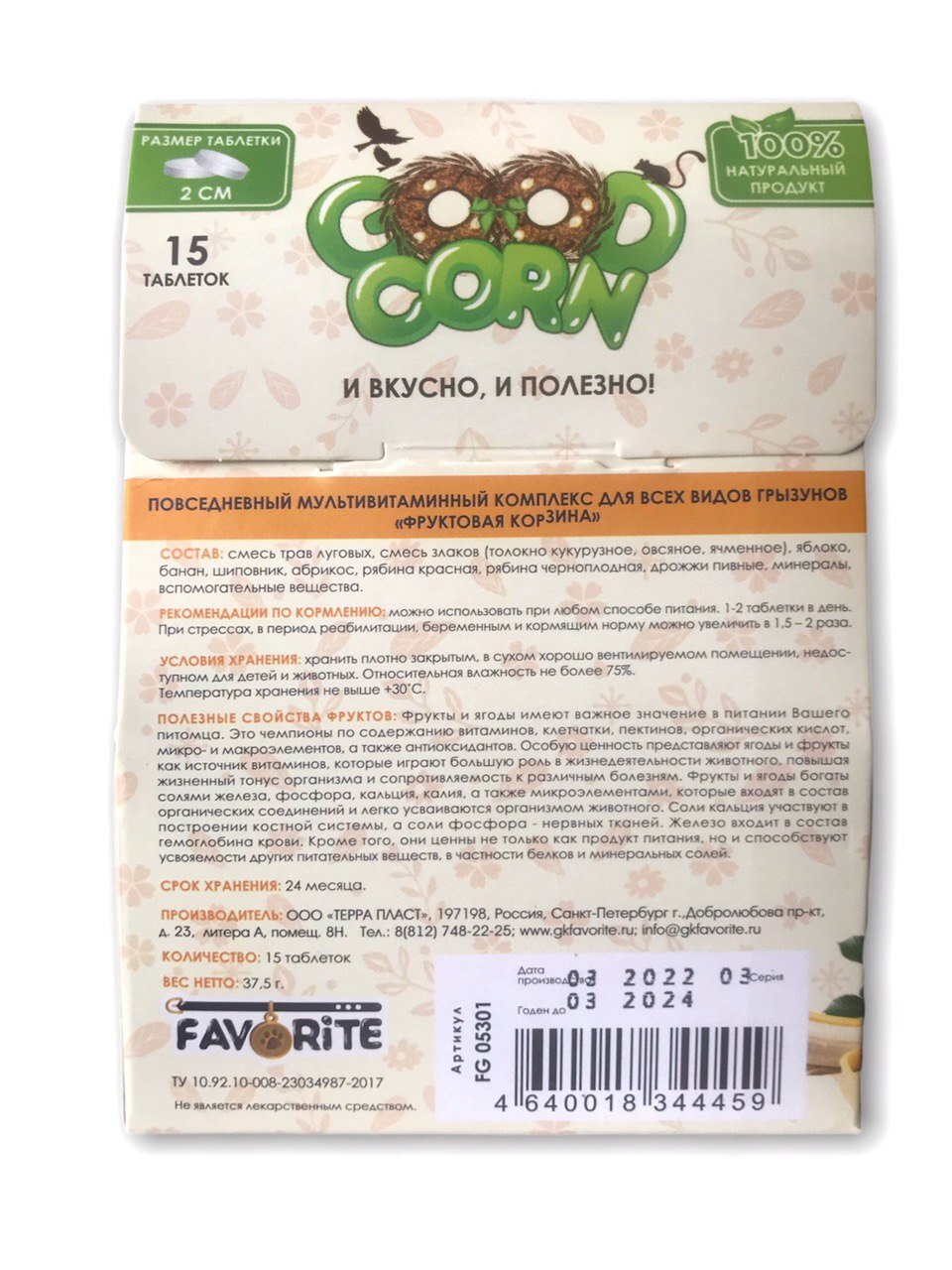 Состав:Смесь трав луговых, смесь злаков(толокно кукурузное, овсяное, ячменное), яблоко, банан, шиповник, абрикос, рябина красная, рябина черноплодная, витамин C, дрожжи пивные, вспомогательные вещества.Описание:Витамин C имеет первостепенное значение в з