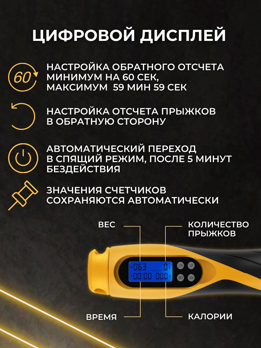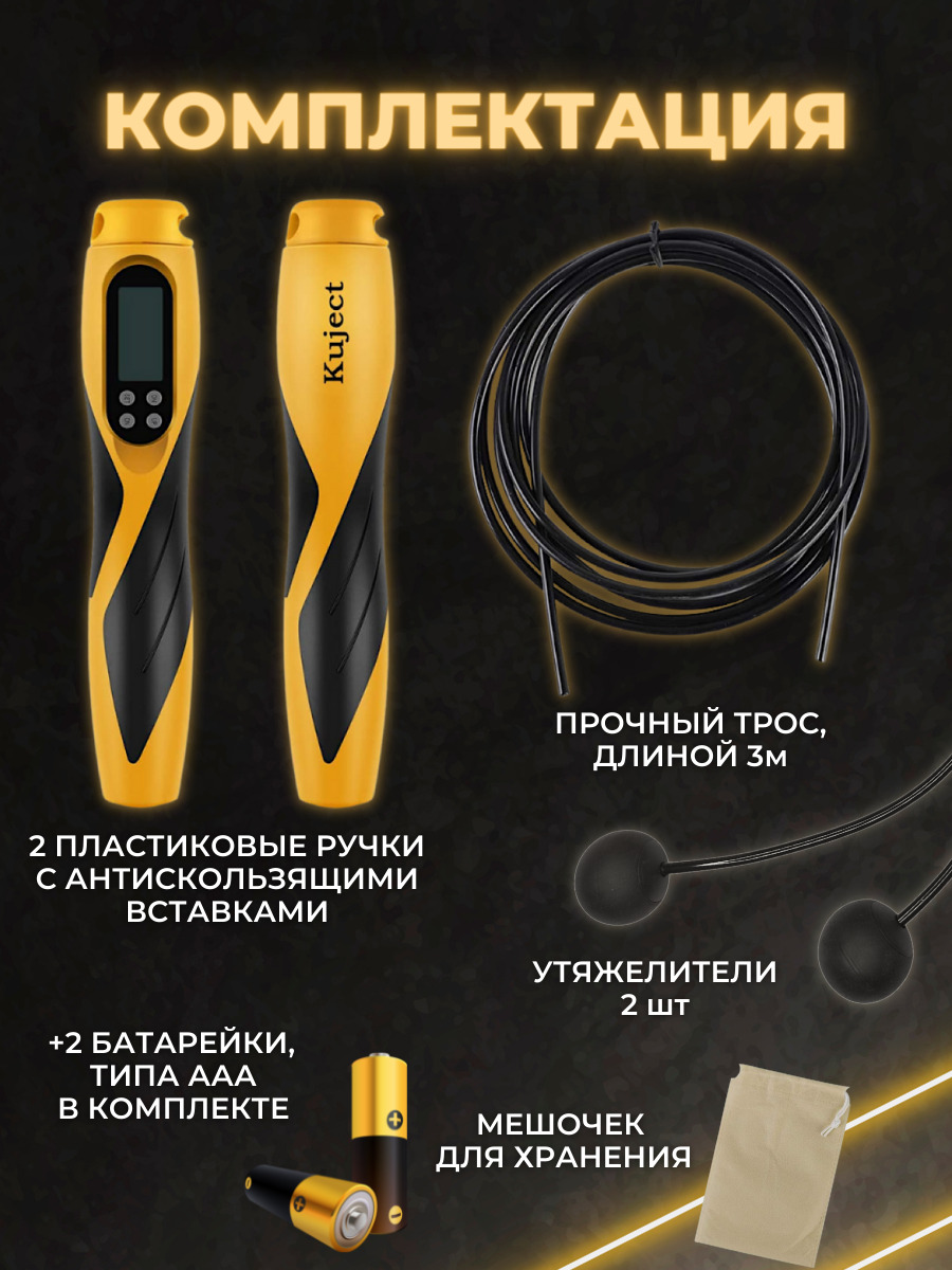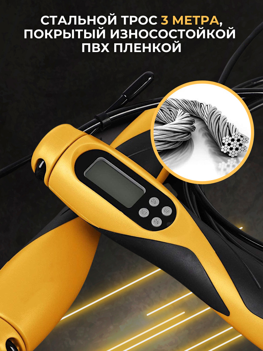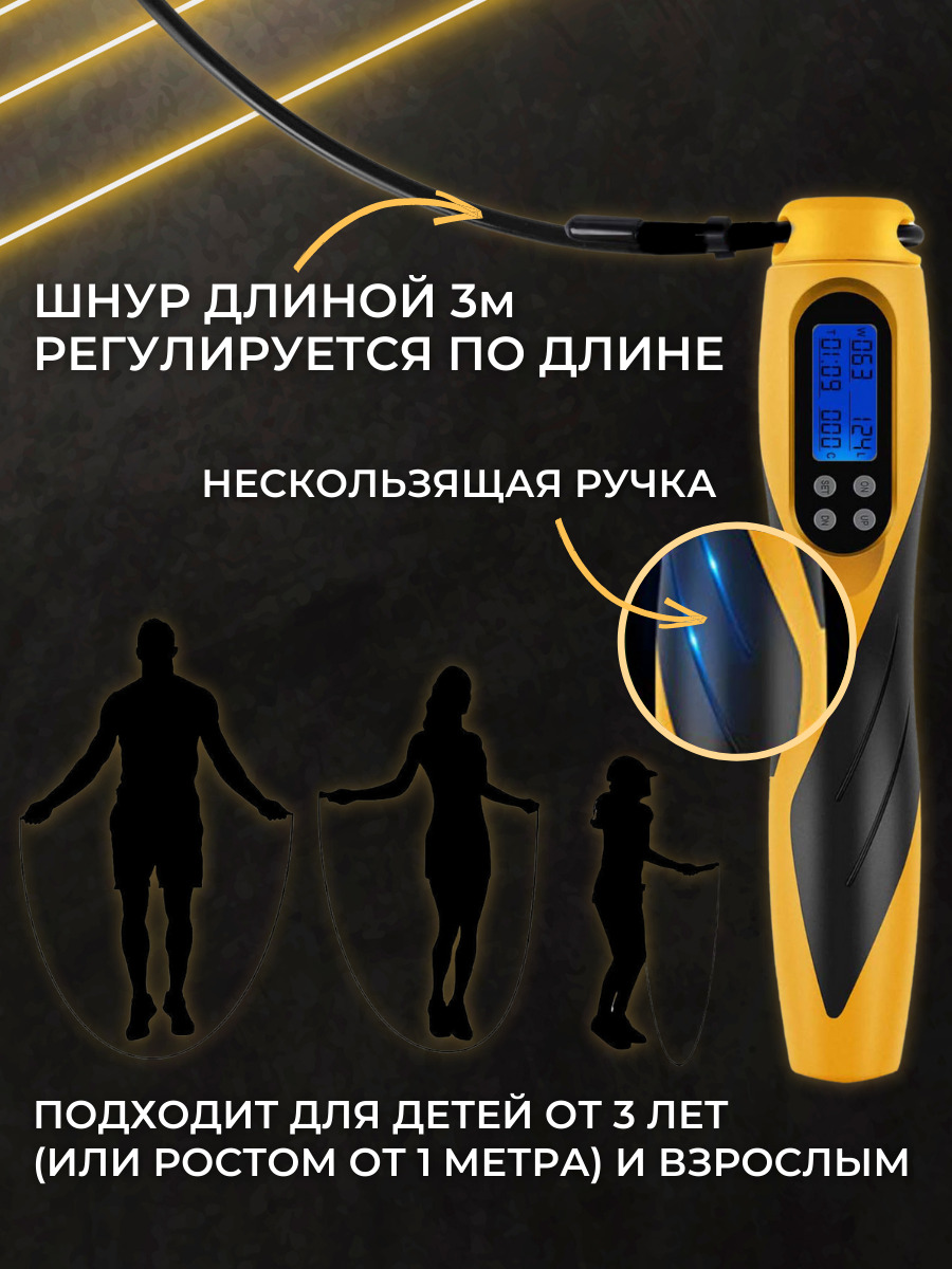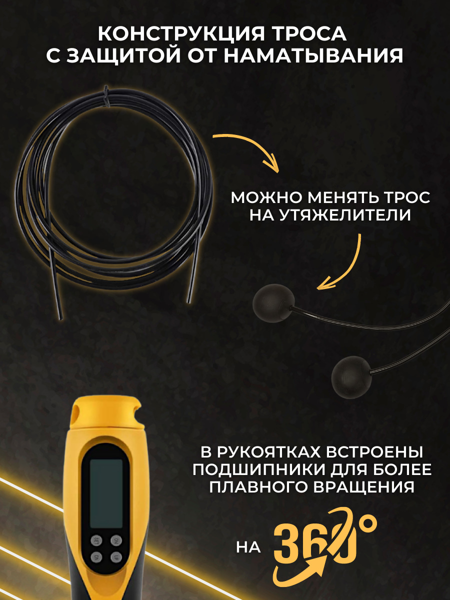 Особенности фитнес-инвентаряС регулировкой длины, С утяжелителями, Счетчик прыжков, Чехол в комплекте, Подшипники в рукоятках (ручках), Со счетчиком