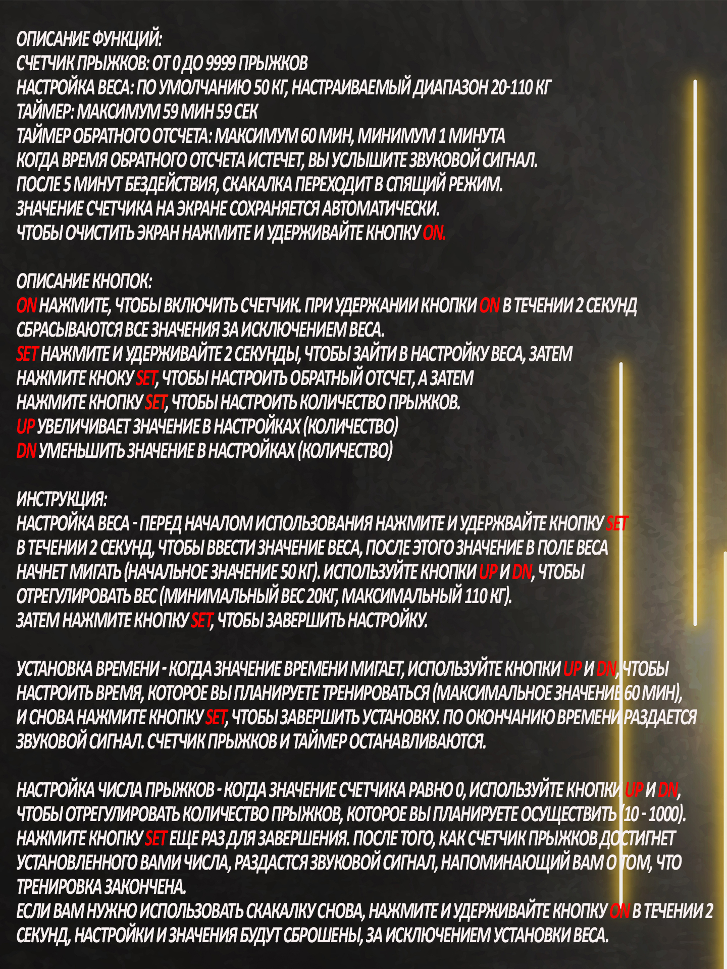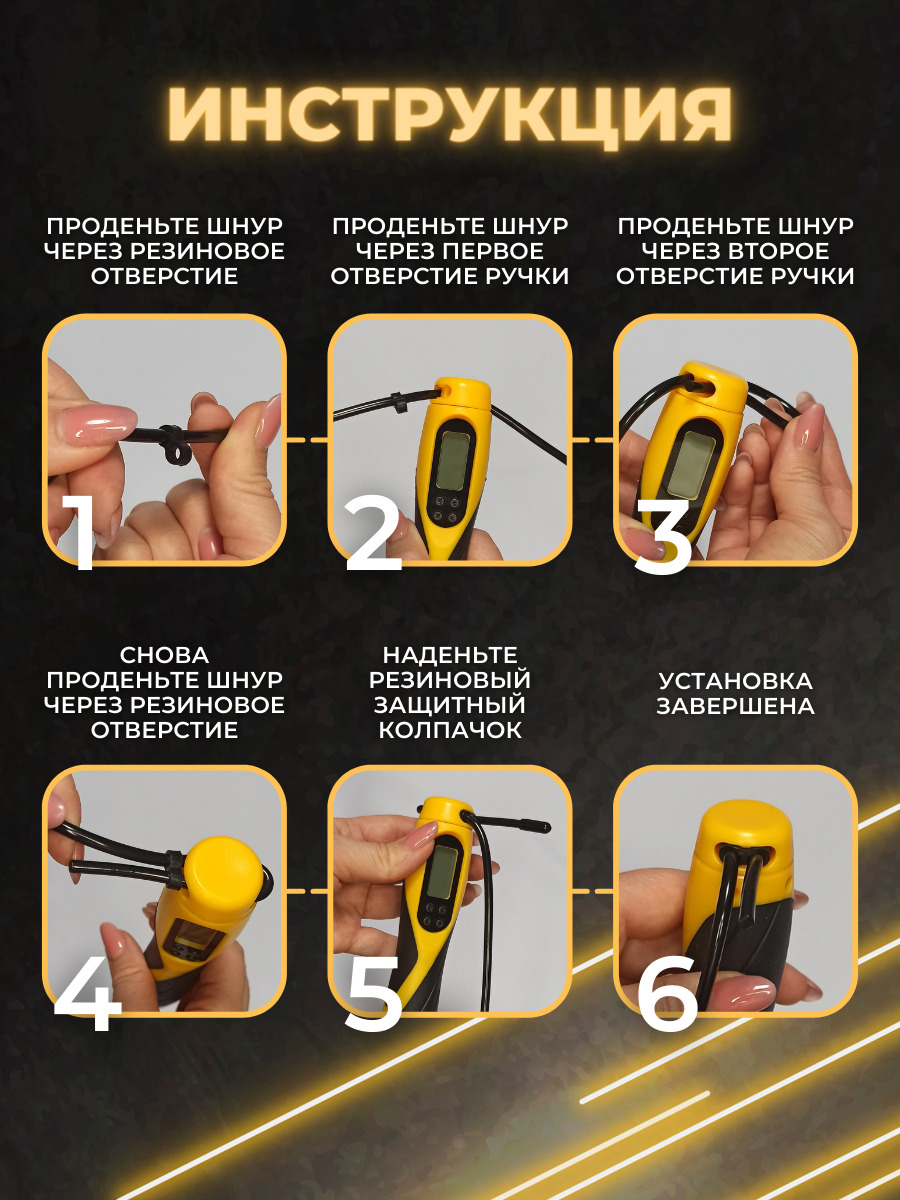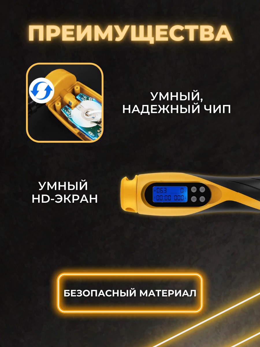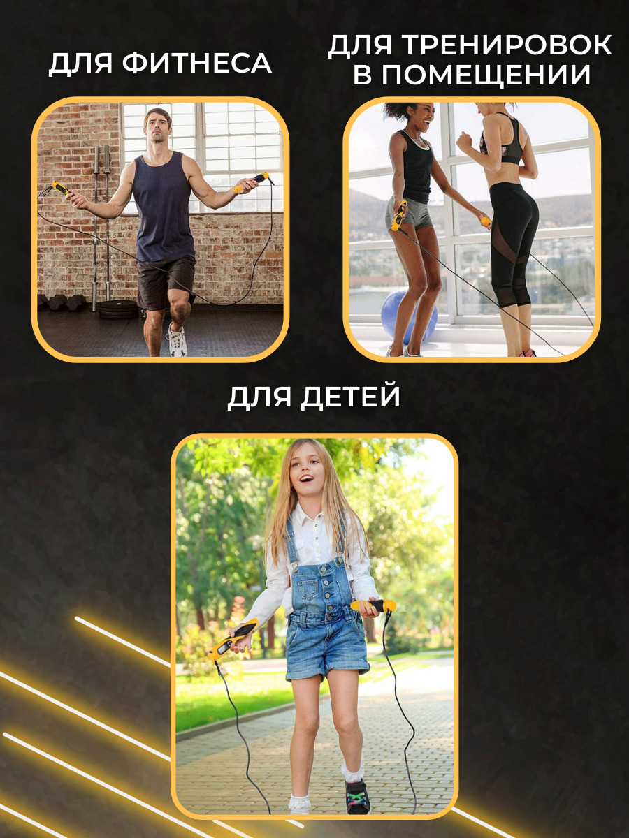 Особенности фитнес-инвентаряС регулировкой длины, С утяжелителями, Счетчик прыжков, Чехол в комплекте, Подшипники в рукоятках (ручках), Со счетчиком