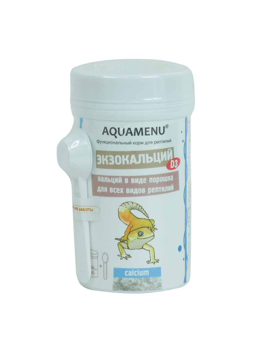 Функциональный корм Aquamenu "Экзокальций+D3" для всех видов рептилий в виде порошка. Способствует развитию костей и помогает избежать симптомов недоедания. Особенно нуждаются в нем черепахи, для которых кальций является самым важным элементом для полноце