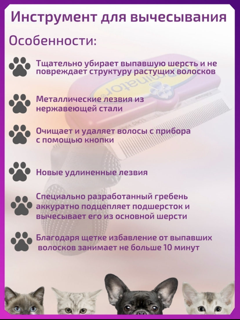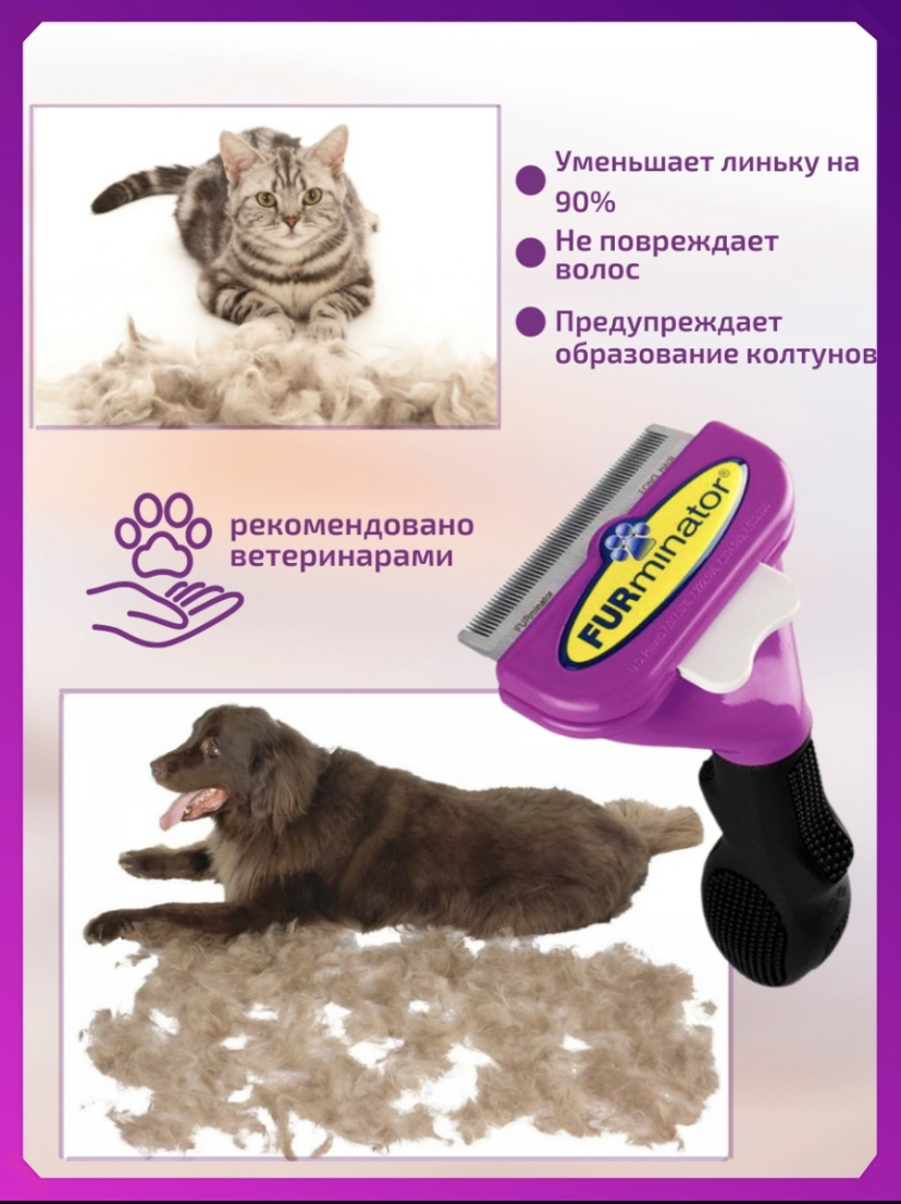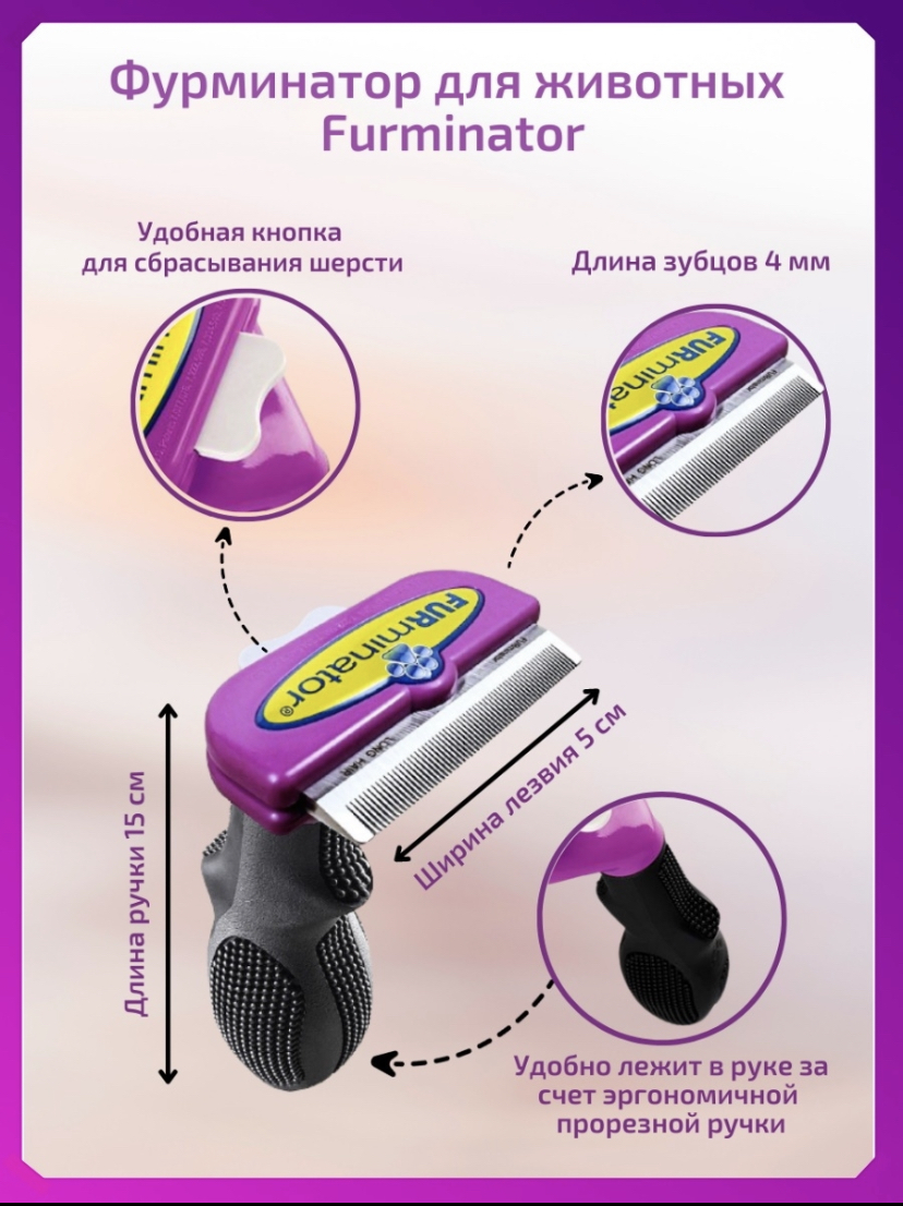 Фурминатор "FURminator" специально разработан профессиональными грумерами для больших и средних пород длинношерстных и короткошерстных кошек от 5 кг с шерстью длиной до 5 см. Но данный дешеддер можно использовать не только для кошек, но и для собак. Это у