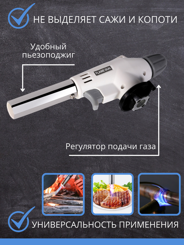 Газовая горелка для баллона FLAME GUN - универсальный и многофункциональный прибор, подходящий как для домашнего хозяйства, так и для ресторанов, сельского хозяйства, походных условий, строительства и даже для микросварки. Насадка на баллон с пьезоподжиго
