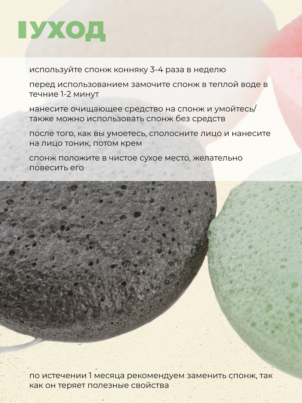 Способ примененияПеред использованием замочите спонж на 1-2 минуты в теплой воде. Очищайте лицо мягкими массирующими движениями, Можно использовать совместно с умывающими средствами После процедуры сполосните лицо. По истечению 3-4 месяцев рекомендуем заменить спонж, та