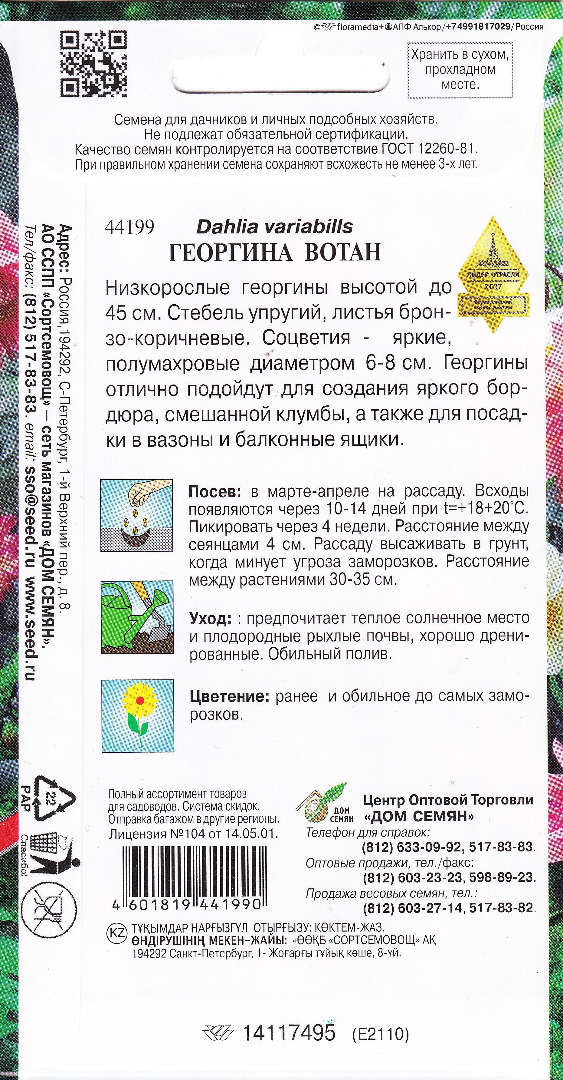 Комплектация:1 пакет - 15 шт семян георгины ВОТАНОписание:Эффектные разноцветные георгины с бронзо-коричневыми листьями.Отлично подойдут для посадки в вазоны и балконные ящики,а также для создания яркого бордюра или смешанной клумбы.Высота до 45 см.Георг