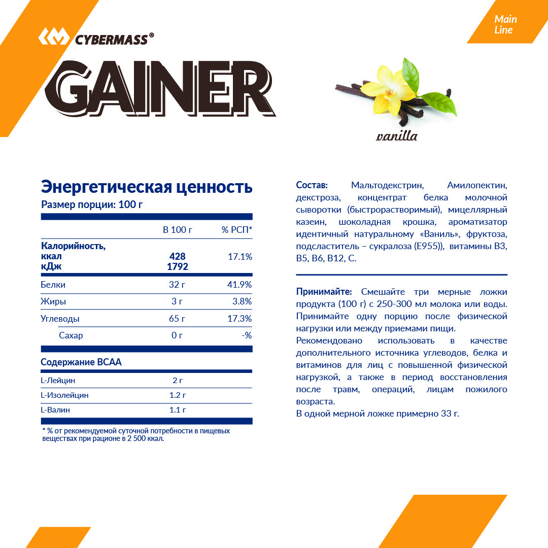 СоставМальтодекстрин,амилопектин,декстроза,быстрорастворимый концентрат белка молочной сыворотки,мицеллярный казеин,шоколадная крошка, ароматизатор "Ваниль",фруктоза,сукралоза,витамины группы В, С