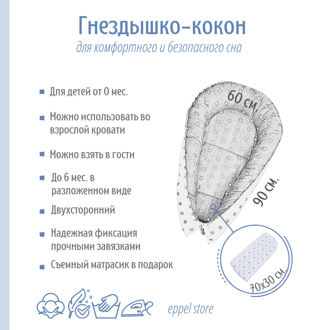 Комплектация:Гнездышко-кокон для новорожденных с матрасиком Описание:Компания Eppel Store поздравляет всех мам с рождением малыша. Выбирая гнездышко нашего производства все мамы выбирают заботу и уют для своего малыша. В нем малыш чувствует себя комфортно