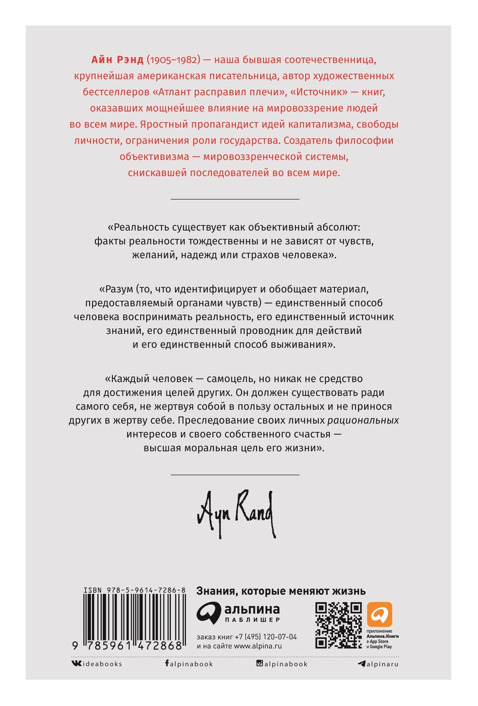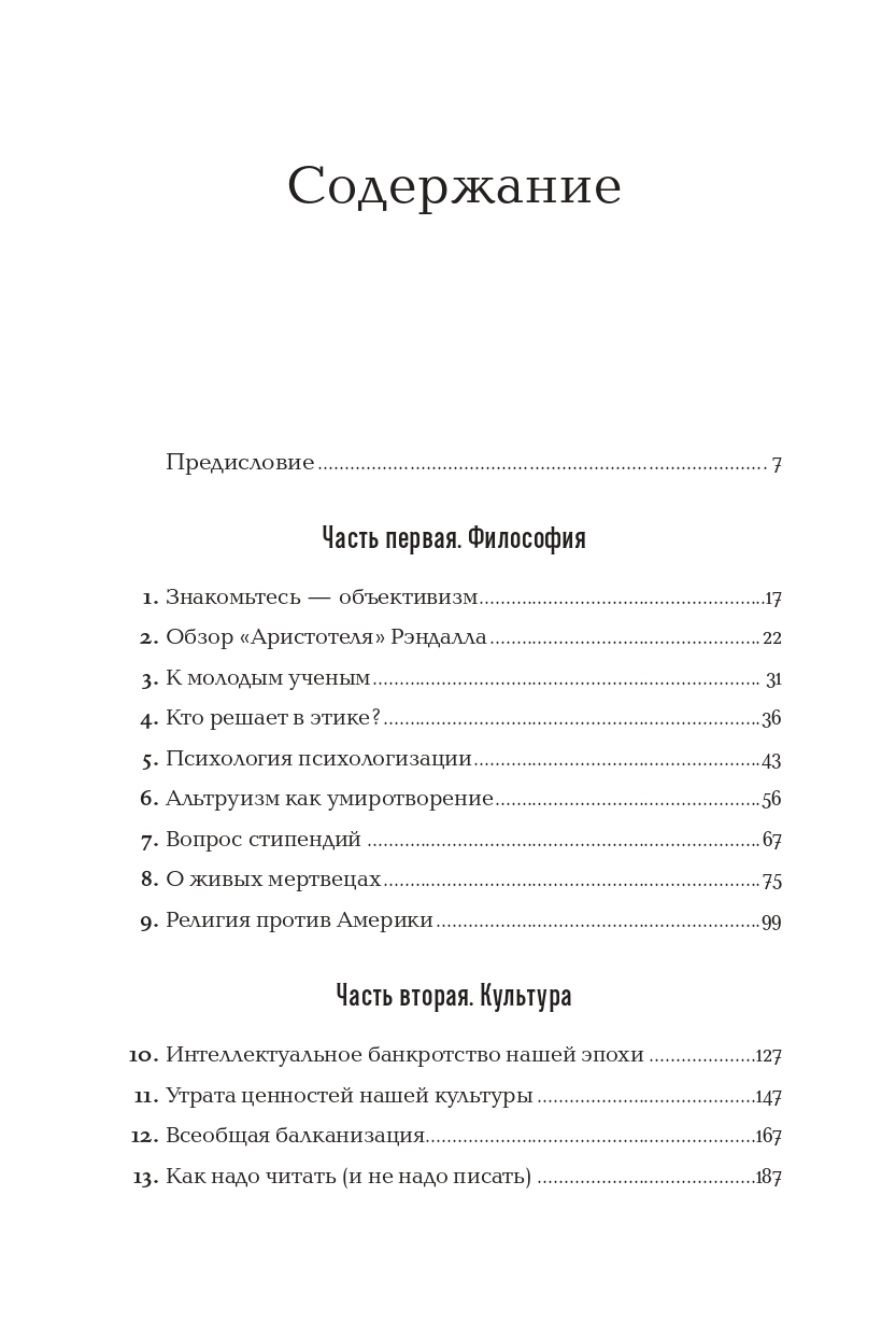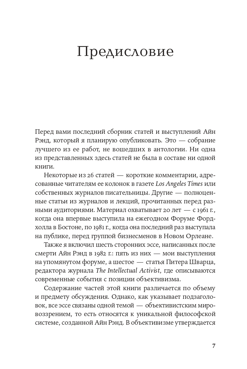 Это сборник лучших работ Айн Рэнд, не вошедших в антологии. Ни одна из представленных здесь статей не публиковалась в других книгах.Все эссе связаны одной темой — объективистским мировоззрением и относятся к уникальной философской системе, созданной Айн Р