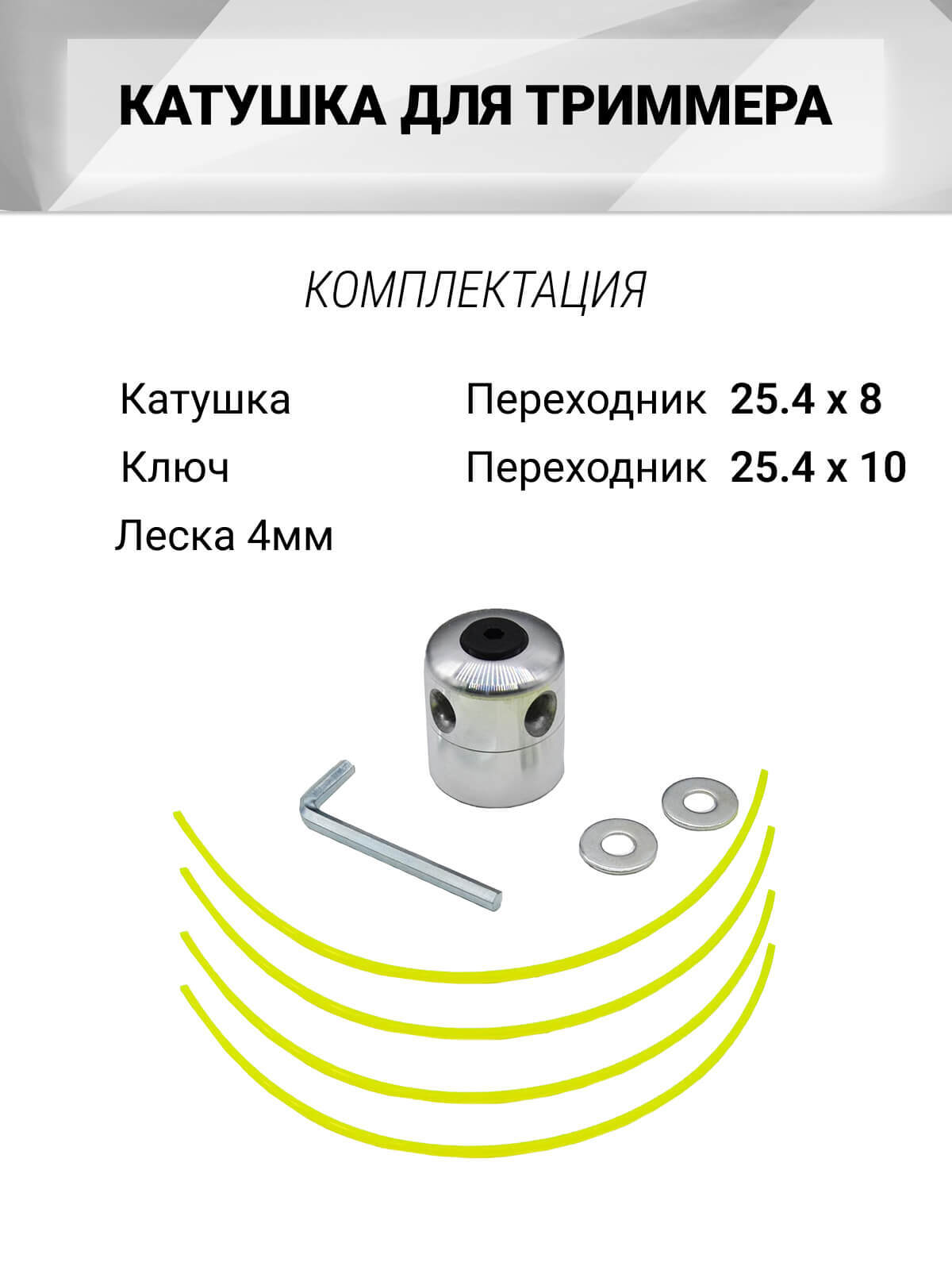 Комплектация:Ключ - 1шт; катушка - 1шт; переходник - 2шт; Леска 4мм - 1штОписание:Универсальная катушка для триммеров, данная головка для триммера является универсальной и подходит на все модели. Полностью алюминиевый корпус, леска универсальная, можно ис