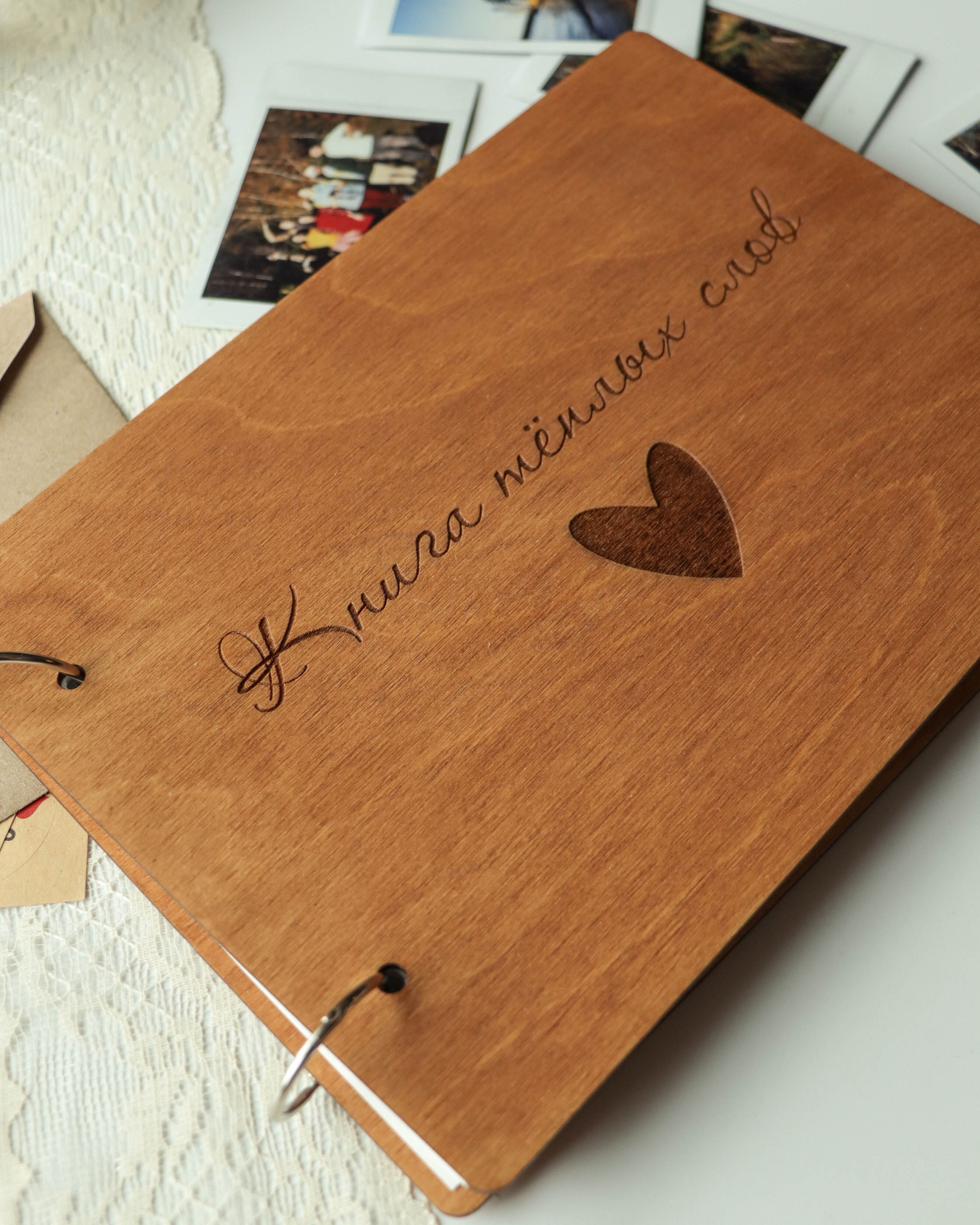 Комплектация:1 штОписание:Книга теплых слов из дерева с гравировкой в виде сердца сохранит для вас пожелания родственников, друзей и коллег. Это лучший подарок на день рождения или юбилей, свадьбу, помолвку, 14 февраля. Обложка окрашена пропиткой премиум
