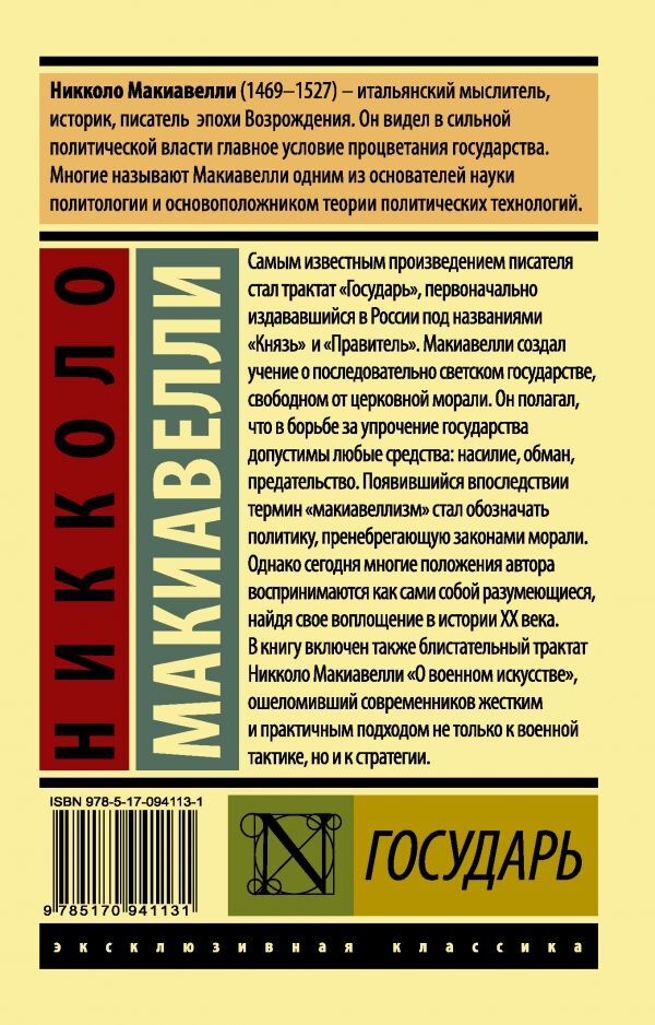 Самым известным произведением писателя стал трактат "Государь", первоначально издававшийся в России под названиями "Князь" и "Правитель". Макиавелли создал учение о последовательно светском государстве, свободном от церковной морали. Он полагал, что в бор