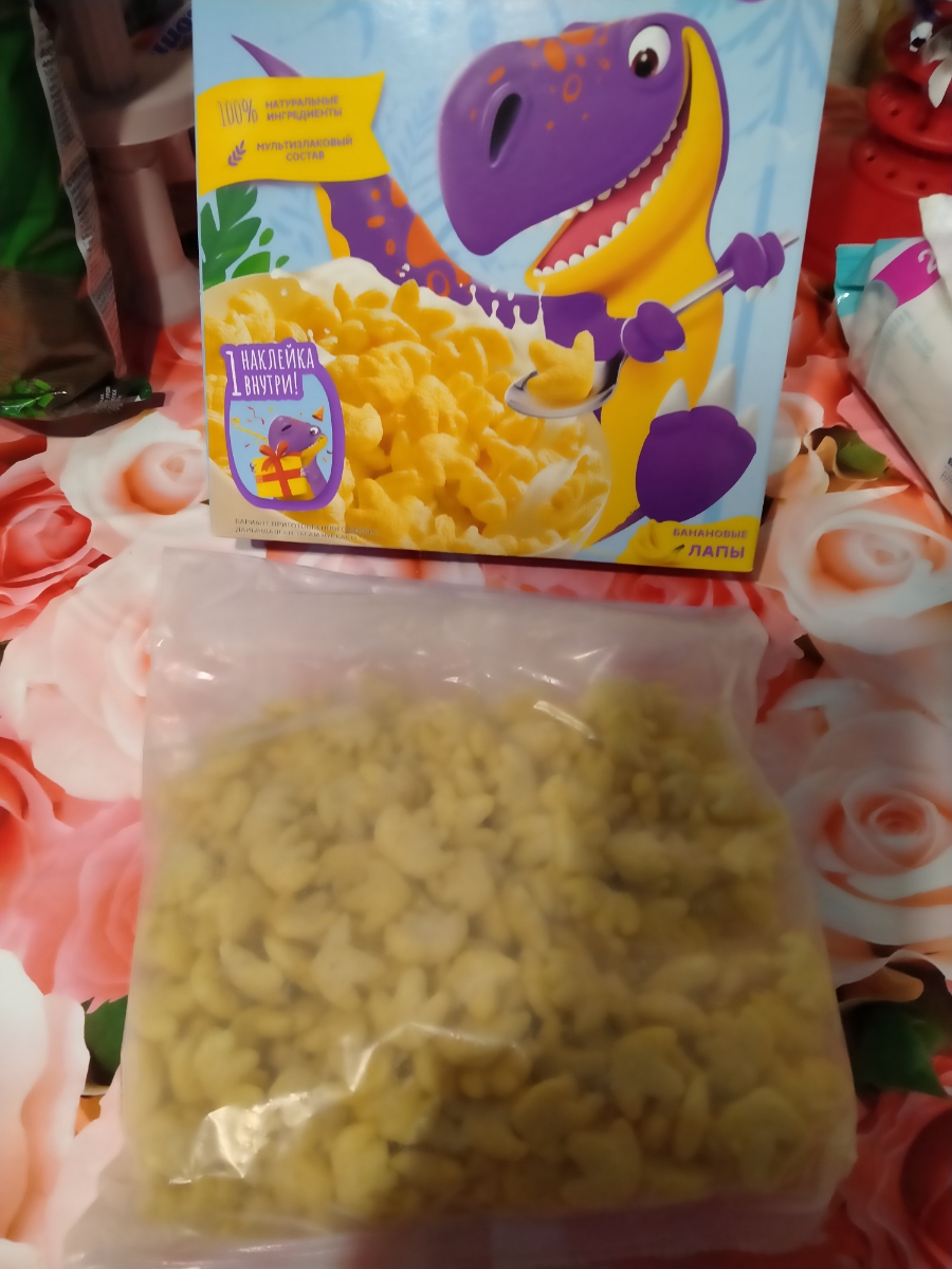 Условия хранения:хранить в сухих проветриваемых помещениях при температуре не выше 20 °С и относительной влажности воздуха не более 75 %. Для сохранения свежести продукта коробку и пакет держать закрытыми.Описание:Готовый завтрак из злаков "Банановые лап
