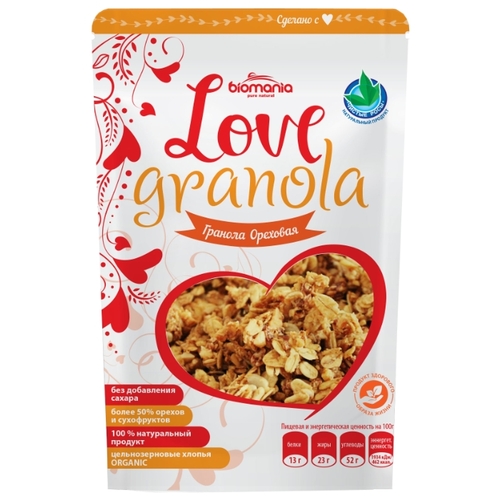 Составцельнозерновые органические овсяные хлопья, изюм, арахис, яблочный сок, миндаль, косточка абрикоса, мед, кешью, пекан, масло оливковое, кардамон, соль морская