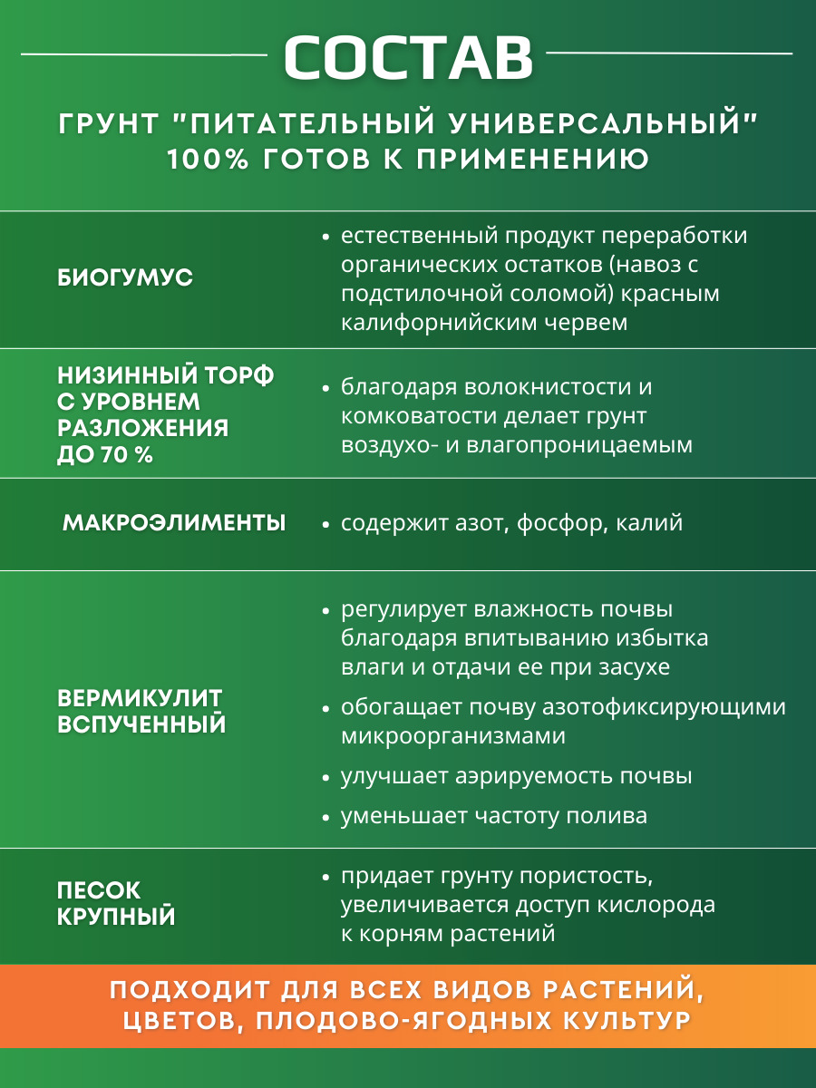 Комплектация:Грунт питательный универсальный Вермион 1 пакет - 5 литров Описание:Грунт "Питательный универсальный"- готовое почвенное удобрение для комнатных растений 5 лРекомендации по применению: Грунт "Питательный универсальный" - готовый почвогрунт дл