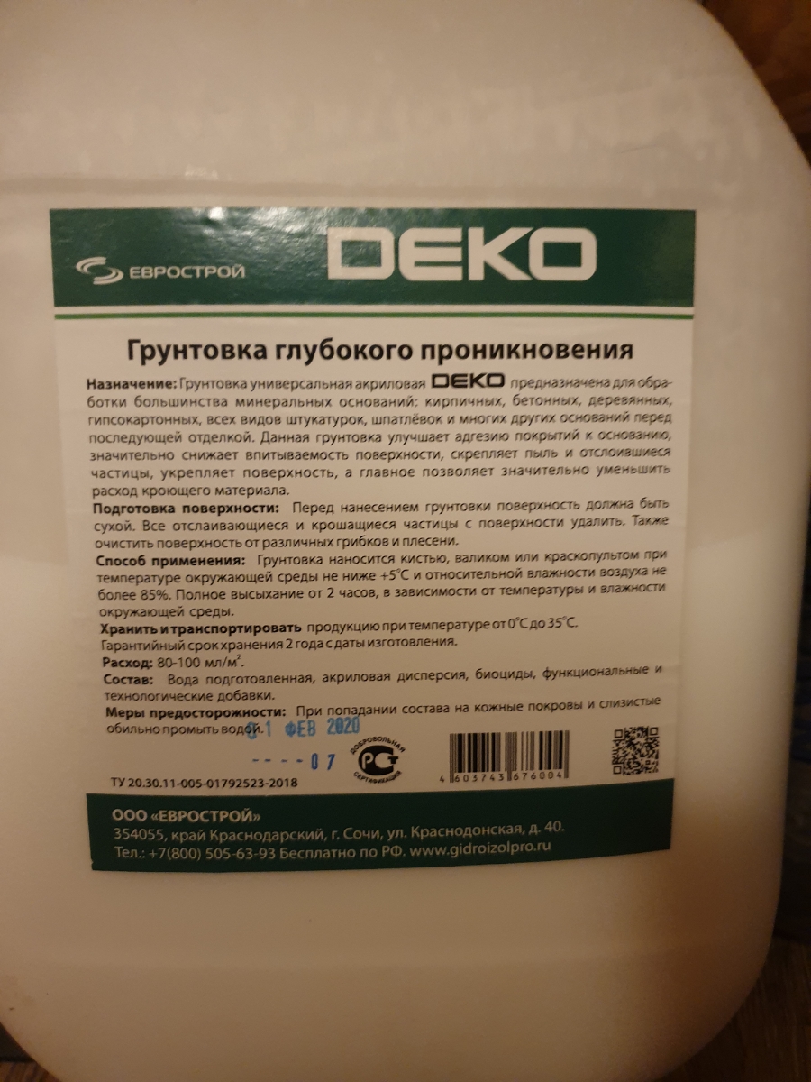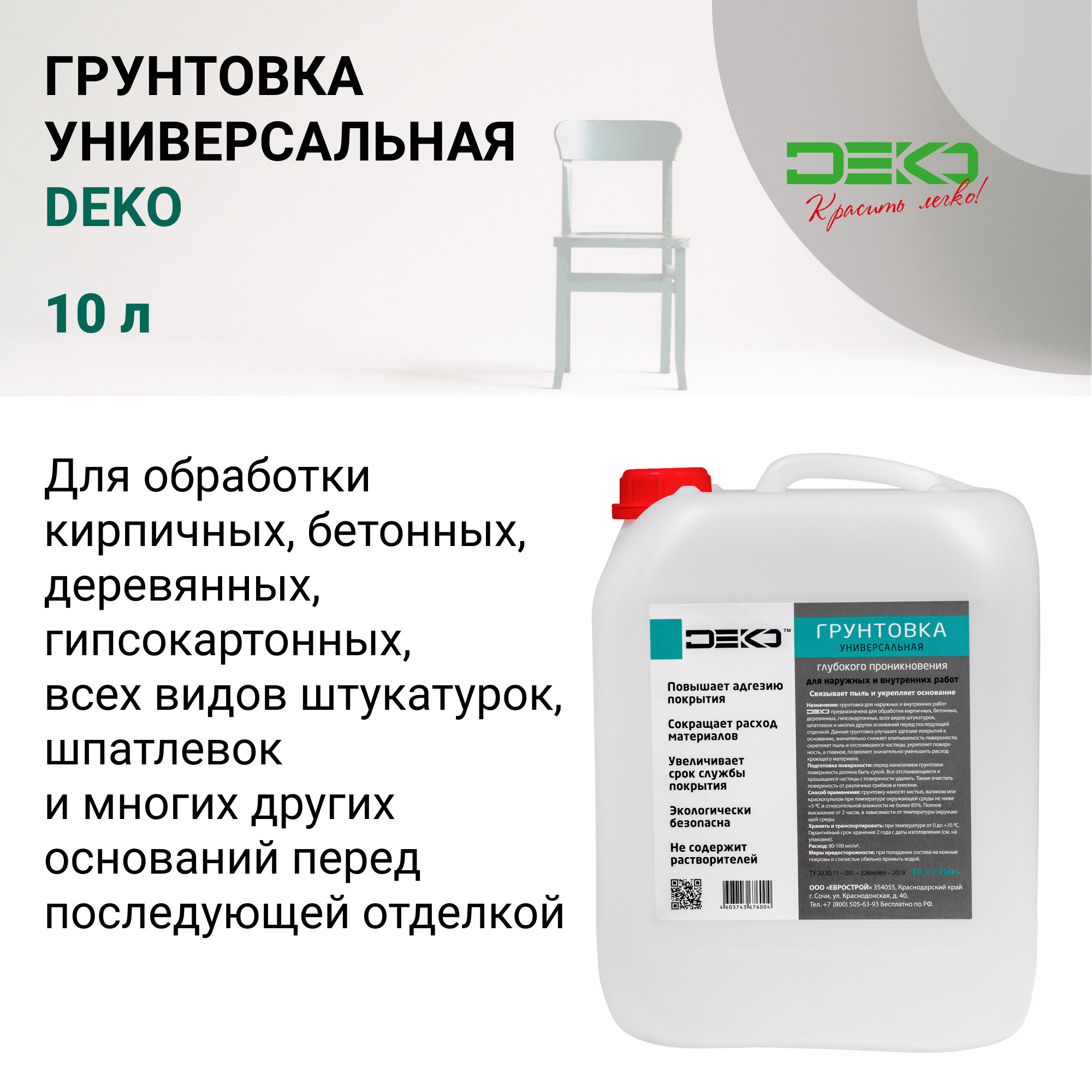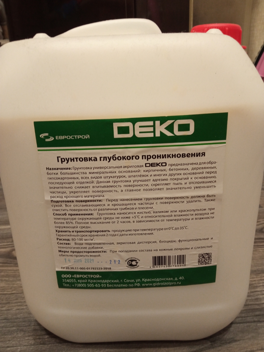 НАЗНАЧЕНИЕГрунтовка DEKO универсальная подходит для наружных и внутренних работ. Предназначена для обработки кирпичных, бетонных, деревянных, гипсокартонных, всех видов штукатурок, шпатлевок и многих других оснований перед последующей отделкой. Данный гру