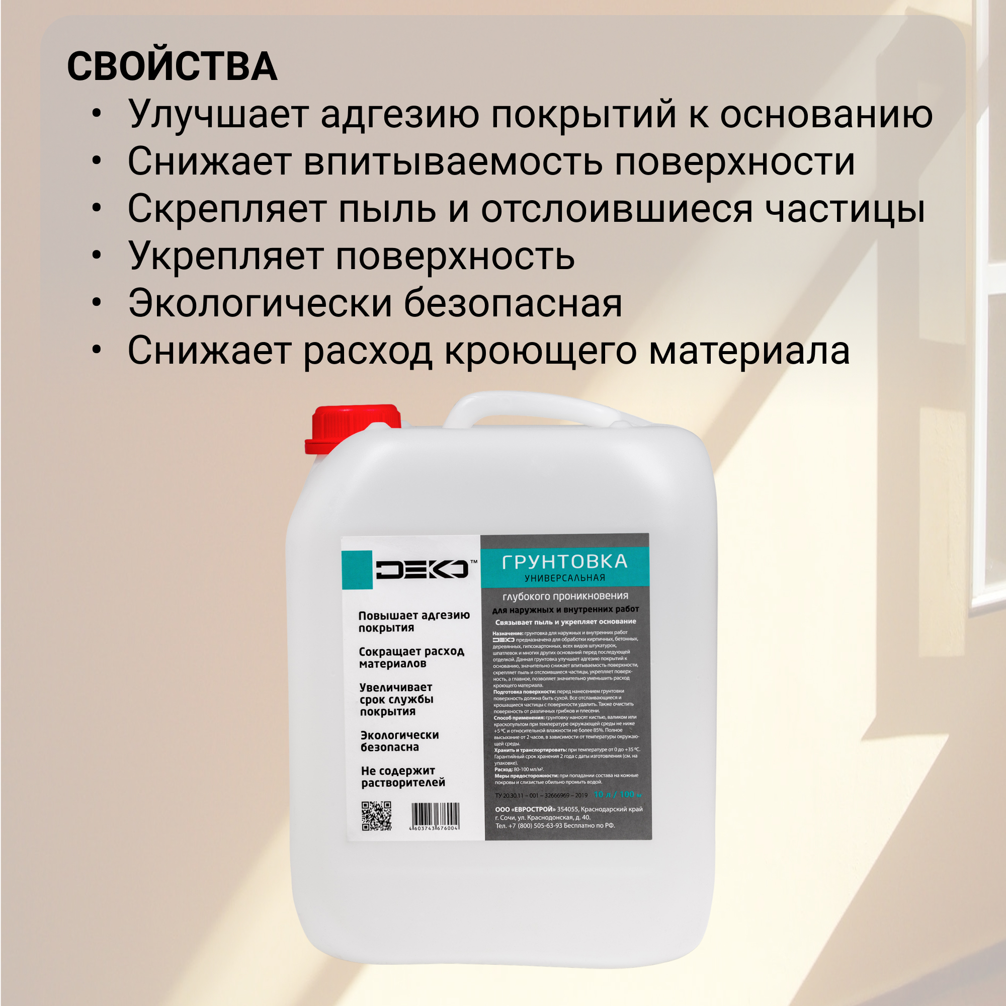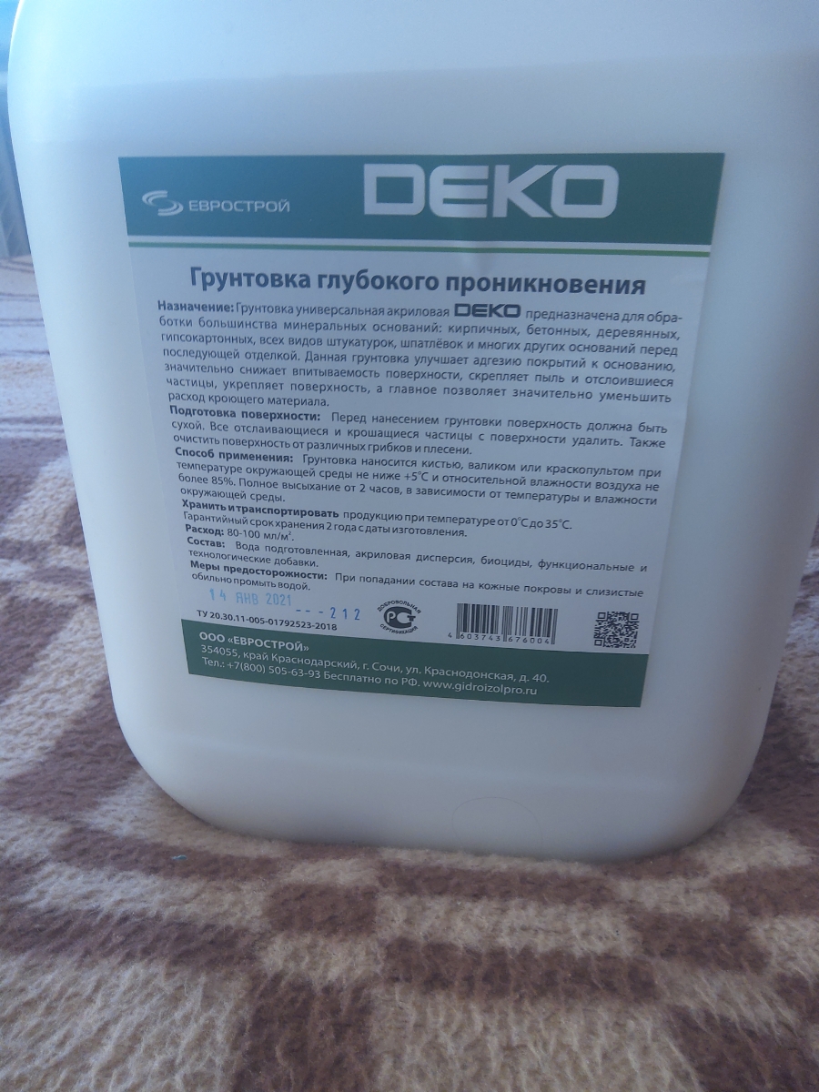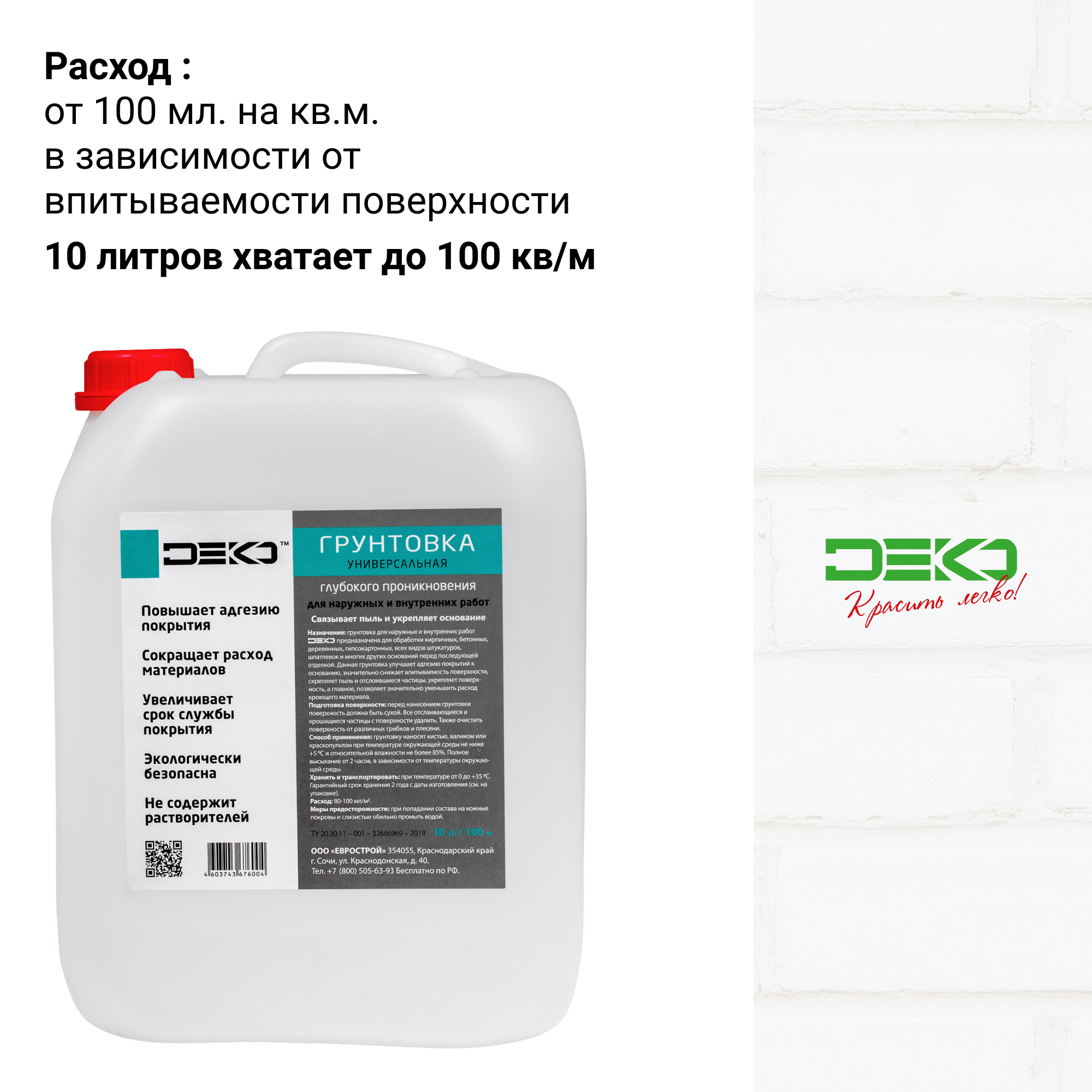 НАЗНАЧЕНИЕГрунтовка DEKO универсальная подходит для наружных и внутренних работ. Предназначена для обработки кирпичных, бетонных, деревянных, гипсокартонных, всех видов штукатурок, шпатлевок и многих других оснований перед последующей отделкой. Данный гру