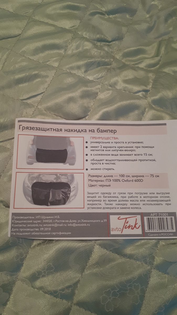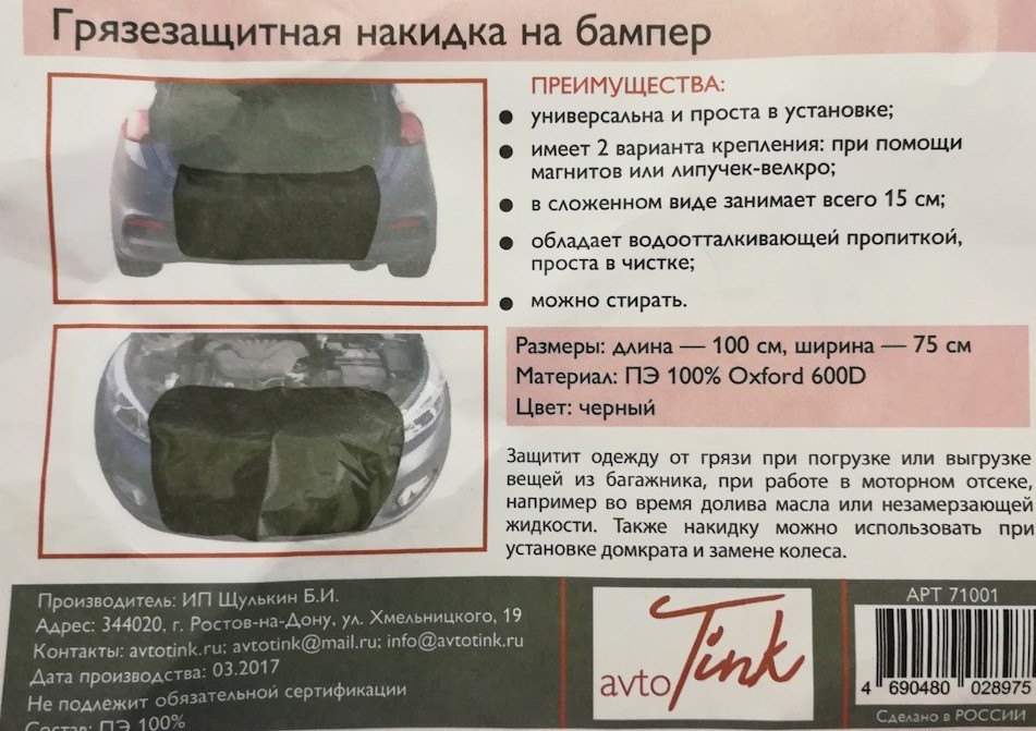 Грязезащитная накидка на бампер "AvtoTink" защищает одежду от грязи при погрузке или выгрузке вещей из багажника, при работе в моторном отсеке (во время долива масла или незамерзающей жидкости). Также накидку можно использовать при установке домкрата и за