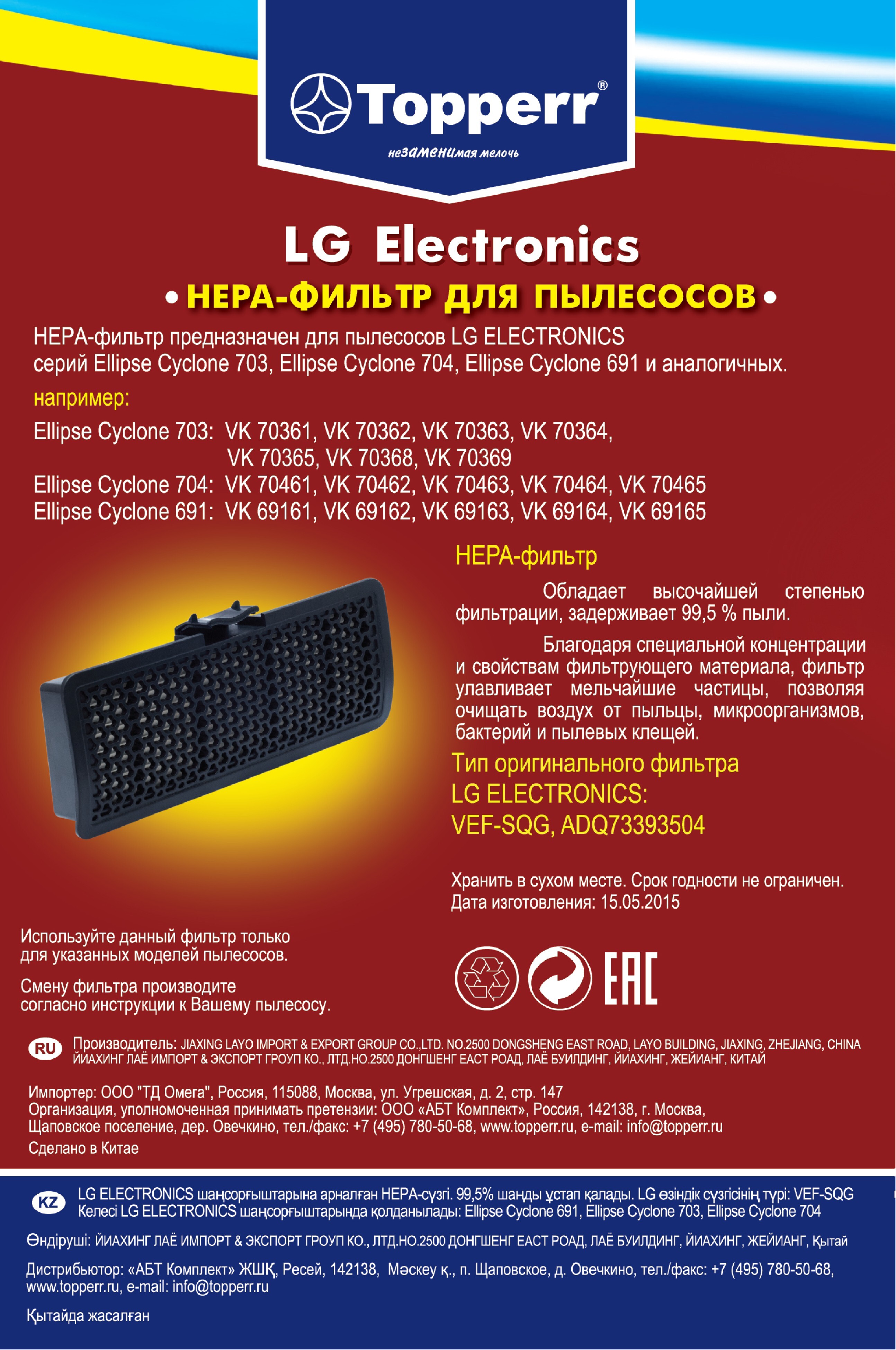 Список совместимых моделейНЕРА- фильтр для пылесосов LG серий Ellipse Cyclone VK704.. (Ориг. тип. VEF-SQG, ADQ73393504)