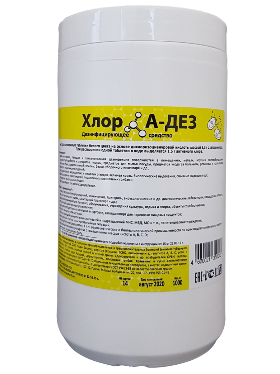 Таблетки белого цвета цилиндрической формы с фасками у основания, массой 3,3 ± 0,3 г, с запахом хлора. Масса активного хлора, образующегося при растворении одной таблетки в воде 1,5 ± 0,2 г, время растворения не более 6 минут.Гранулы мелкие сыпучие белого