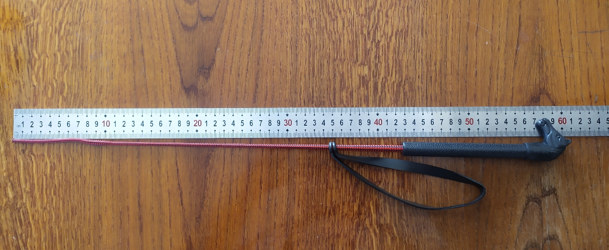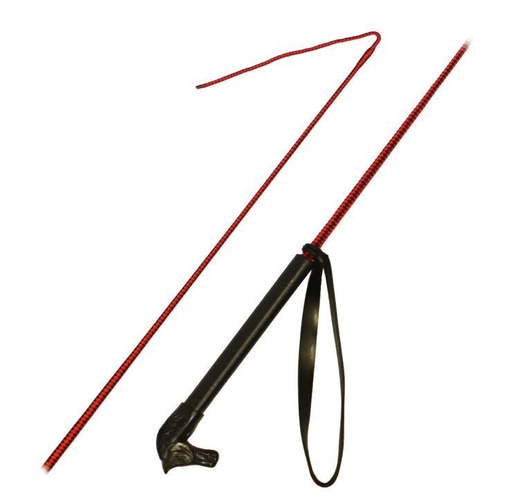 Конкурный хлыст с веревочкой на конце. Ручка в форме головы лошади, ремешок для руки. Длина 75 см