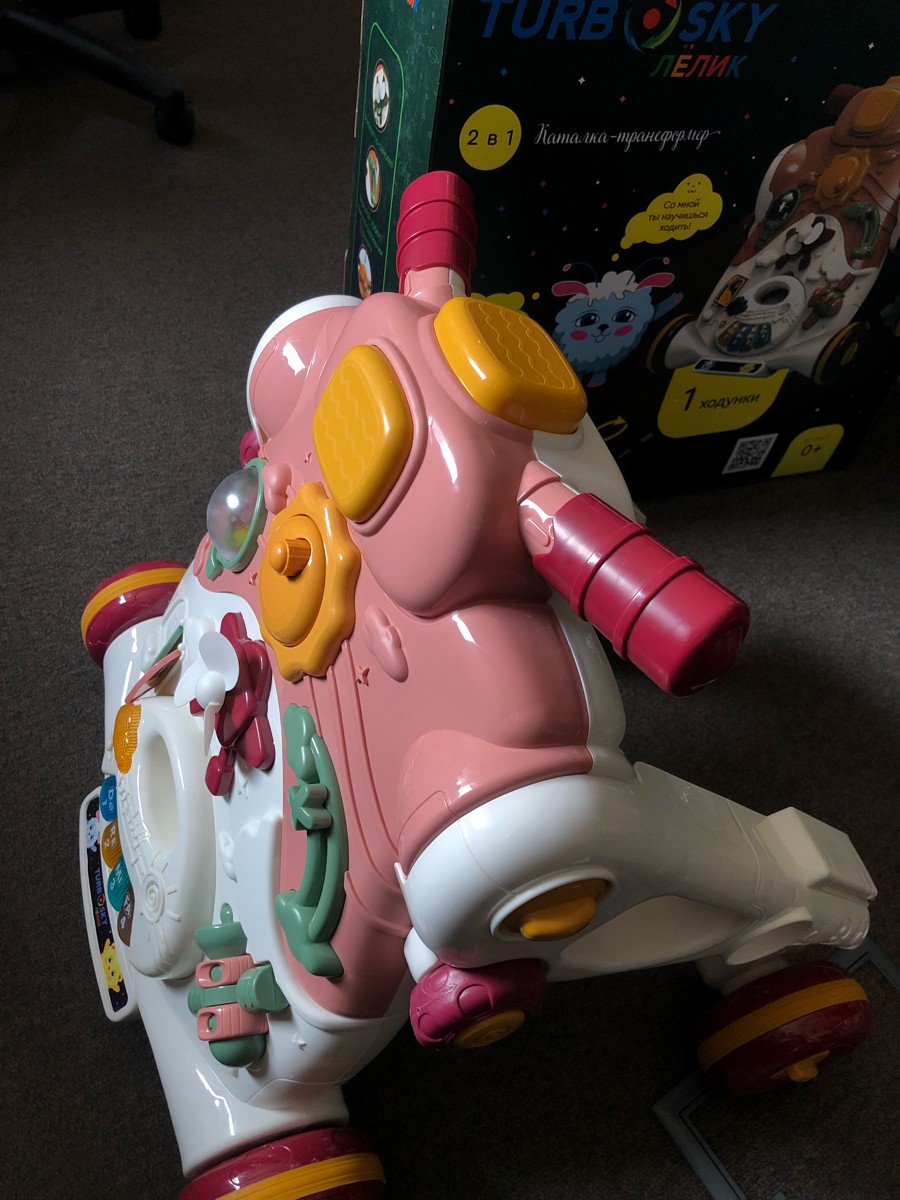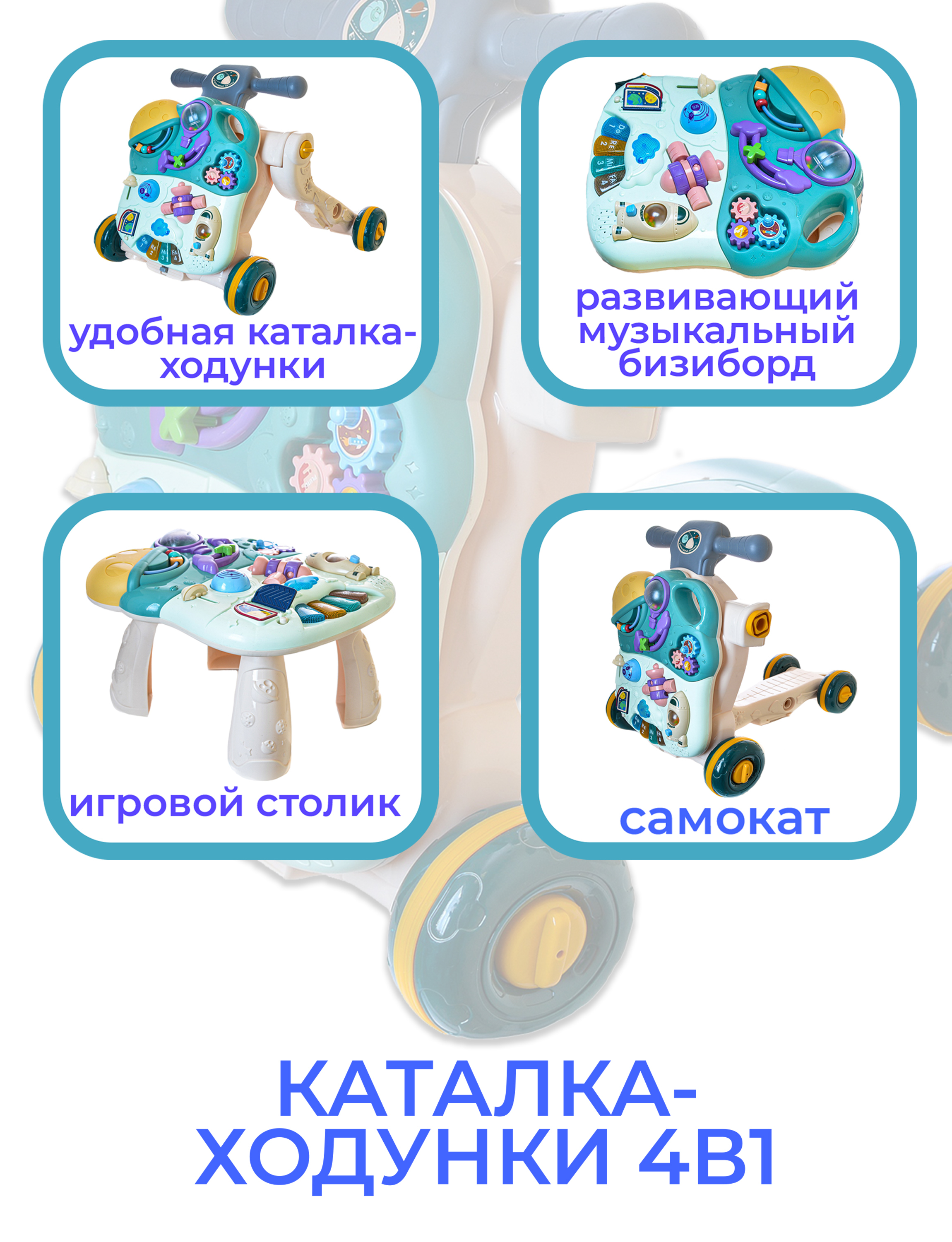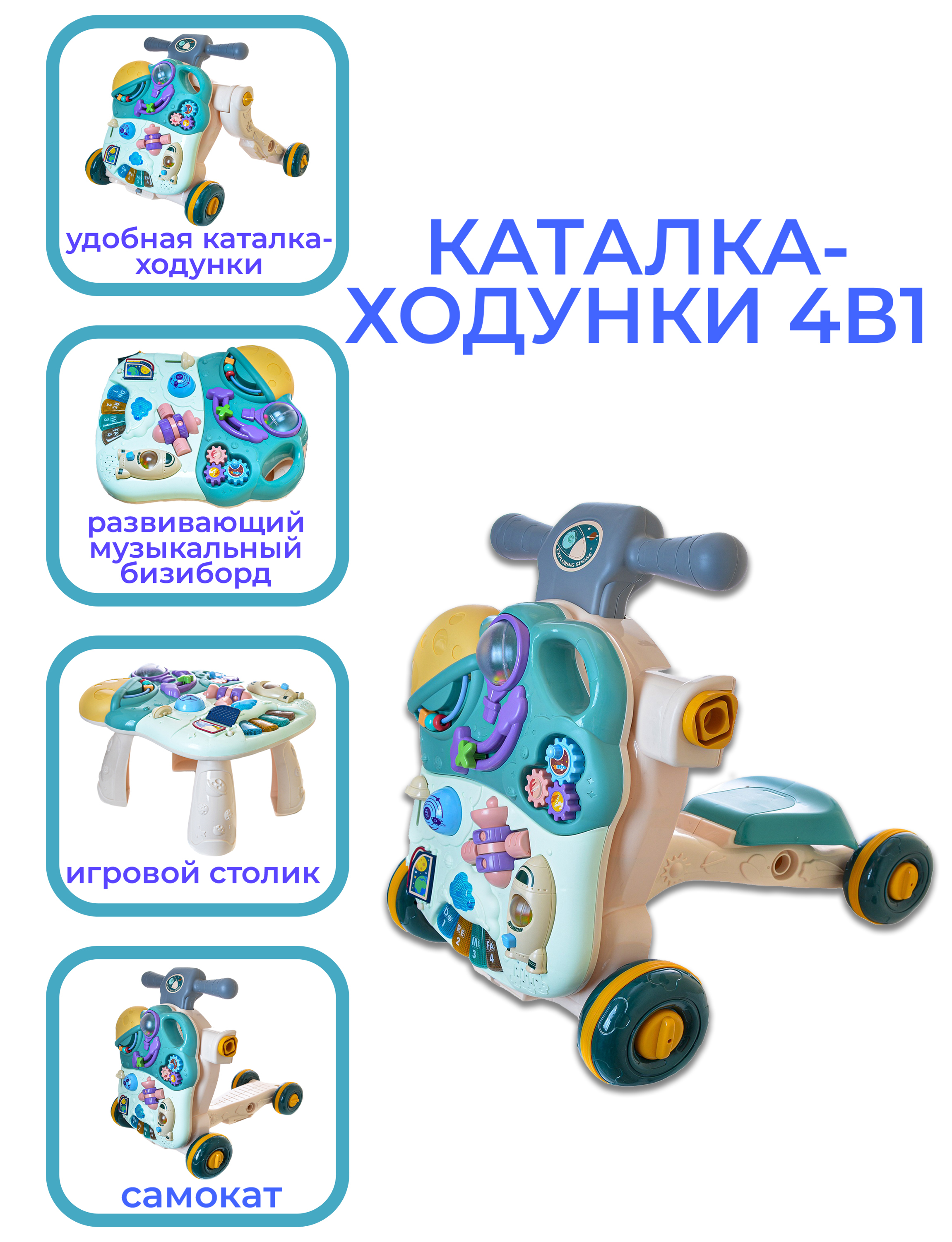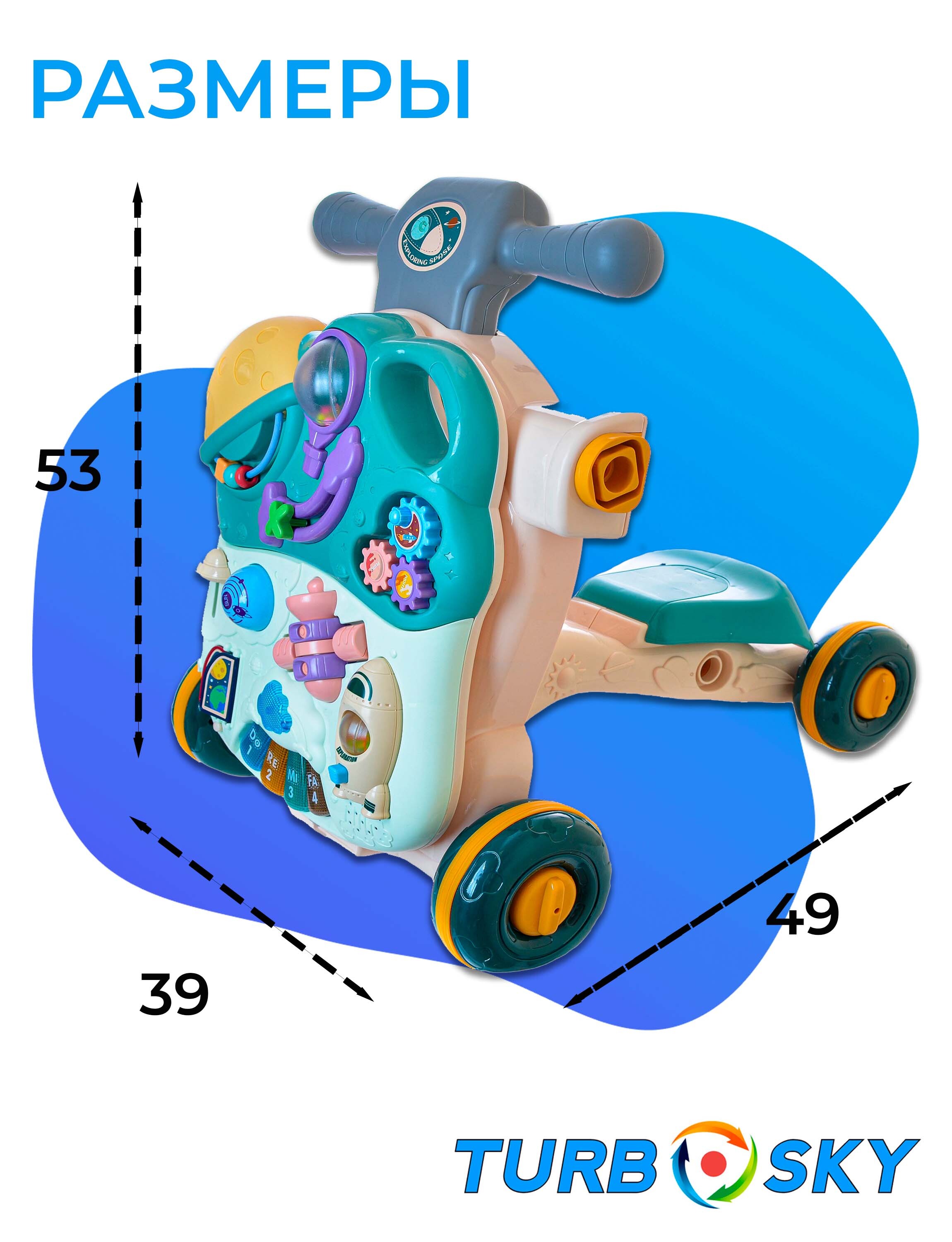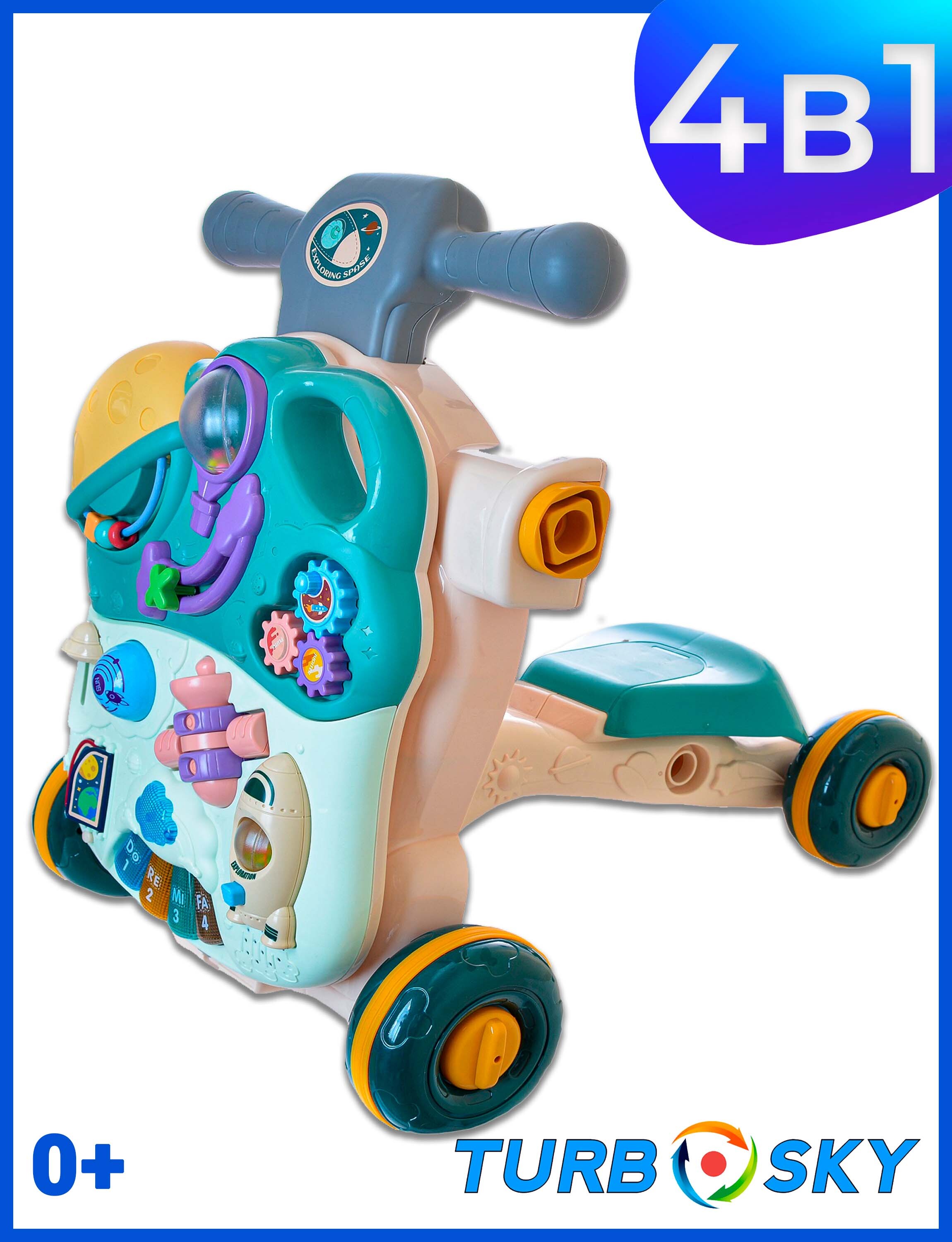 Ходунки-каталка Turbosky Лёлик 4 в 1 поможет ребенку встать на ножки и сделать первые уверенные шаги. Ребенок может за ручку толкая каталку перед собой, также может и сидеть, толкая каталку ножками.Ходунки детские снабжены электронной панелью со звуковыми