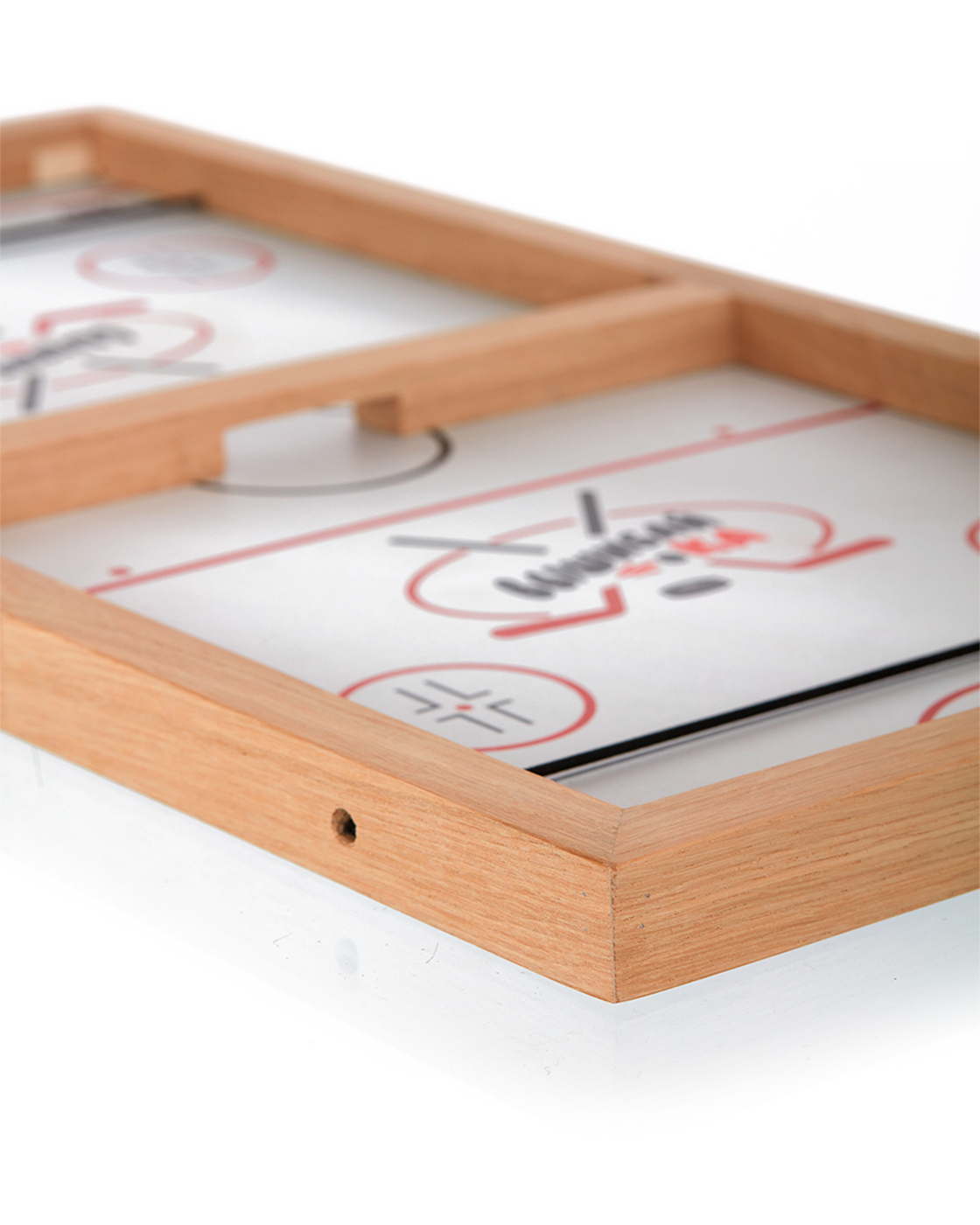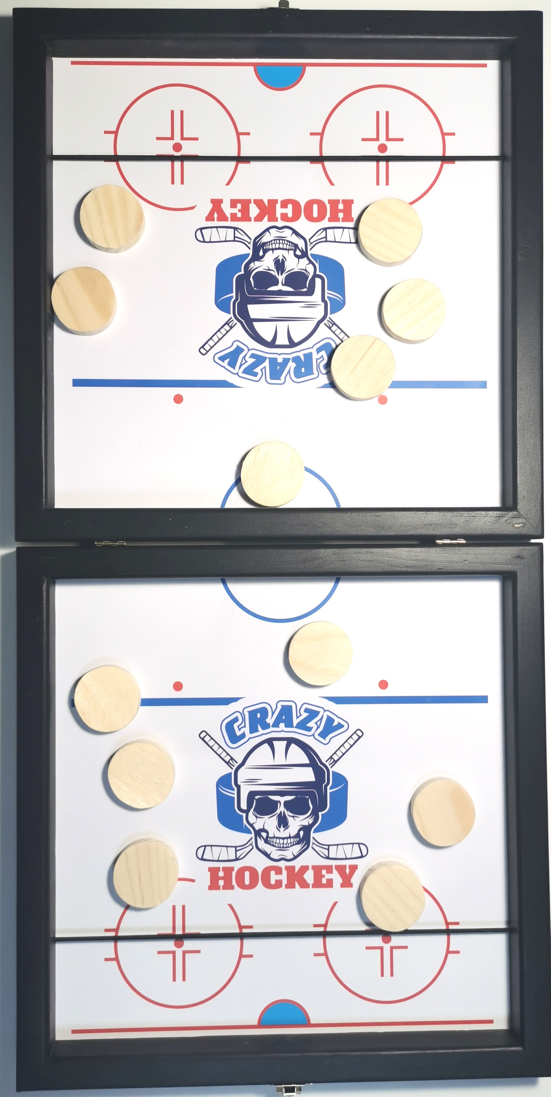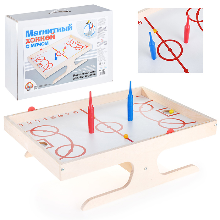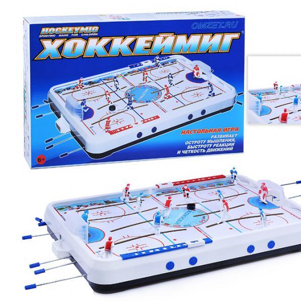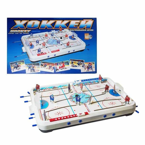 Настольная игра "Хоккей" состоит из игрового поля разделённого на три зоны: центральную, зону защиты и зону атаки. На поле устанавливаются ворота, располагаются две хоккейные команды по 6 объемных игроков в каждой: вратарь, правый, левый и центральный нап
