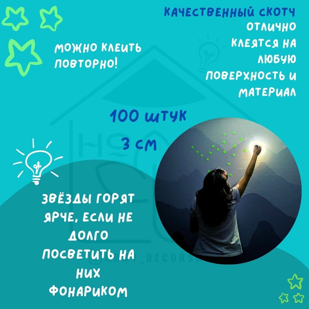 Звёздное небо у вас дома!100 ярких звёзд размером 3x3 см, заряжаются от любых источников света и светятся в темноте c различной интенсивностью. Сделаны из качественного пластика без запаха и абсолютно безопасны для детей. В комплекте двусторонний скотч, к